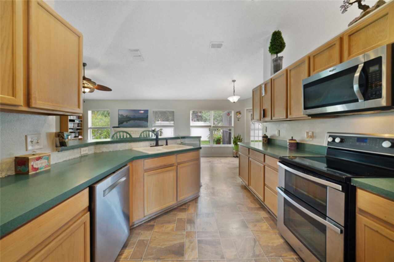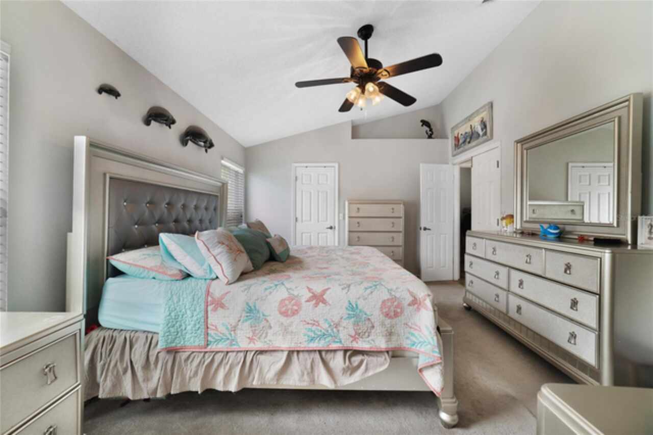 Ceiling Fans(s), Eat-in Kitchen, High Ceilings, Kitchen/Family Room Combo, Open Floorplan, Solid Surface Counters, Solid Wood Cabinets, Split Bedroom, Thermostat, Vaulted Ceiling(s), Walk-In Closet(s)