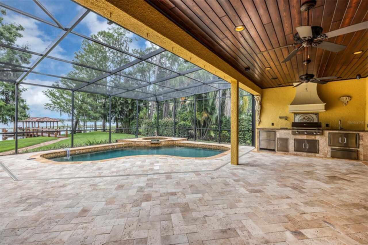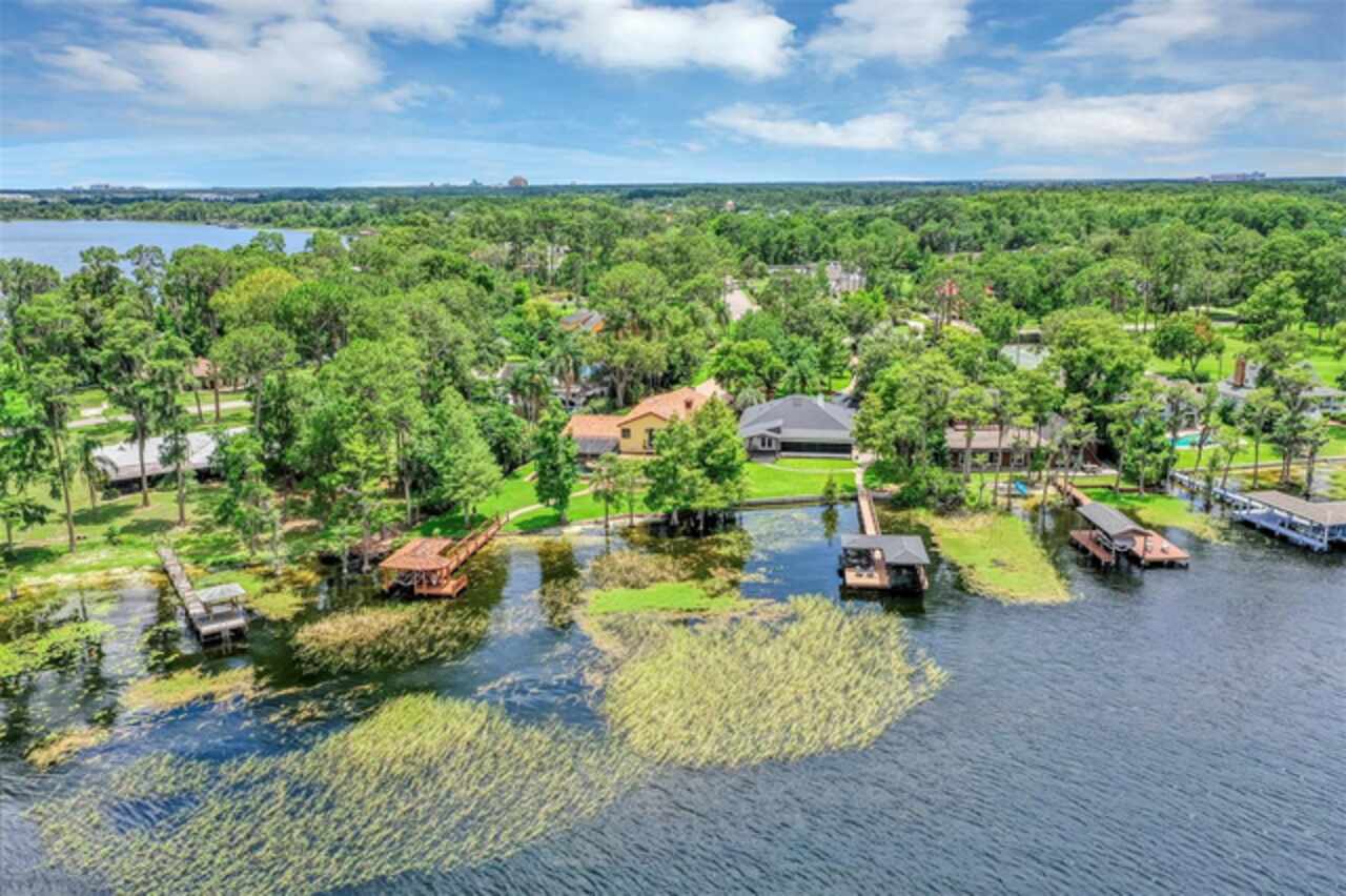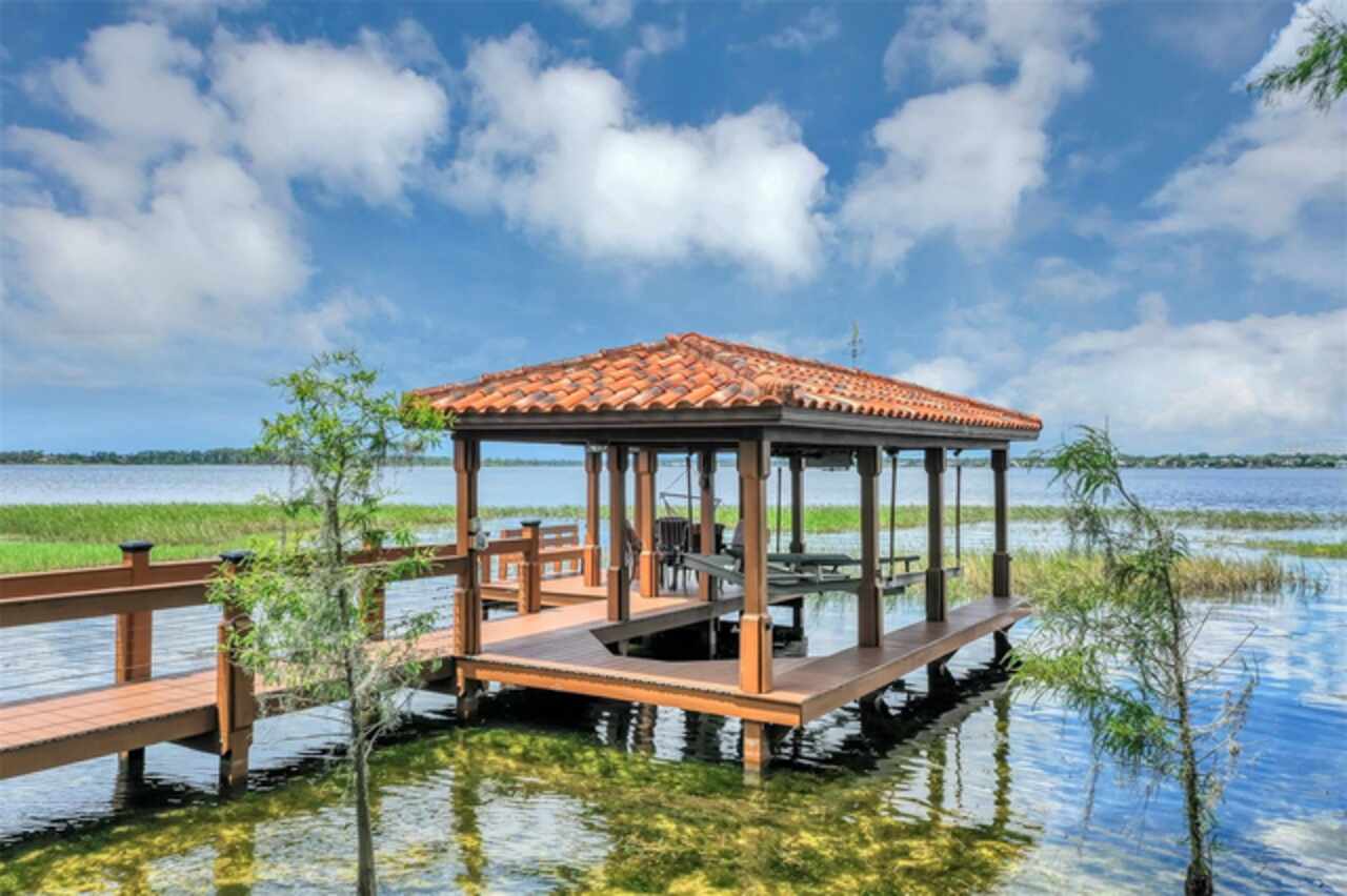 Discover this exquisite lakefront property nestled on over 1.9 acres with more than 100 feet of water frontage on LAKE TIBET and part of the Butler Chain of Lakes. This home offers breathtaking views and absolutely stunning sunsets. As you drive onto the winding paver circular driveway with lovely fountain and beautiful landscaping, you will notice the terracotta tile roof and the undeniable architectural style of this home. The 2 car garage has EV charging station. Once you enter the home you will be impressed with the whole house automation system, motorized window treatments, travertine floors, gas fireplace and crown moulding. At the heart of the home, the chef’s kitchen featuring elegant custom cabinetry, boasts of a large island, granite counter , 2 Sub Zero appliances, reverse osmosis system, pot filler, Wolf steamer, warming drawer and wine fridge. Downstairs are 2 additional bedrooms with en-suites each with special features. Upstairs, You will admire the solid hardwood flooring and attention to details. Primary suite overlooks the breath taking view of Lake Tibet and features en-suite adorned with stone flooring with stand alone tub and separate shower. The primary suite has a large walk-in closet with a custom built closet system w/safe and another separate closet. Two additional bedrooms upstairs share a full bath. A sparkling pool w/spa within the screened patio offers a tropical escape with a summer kitchen featuring, large grill, hotplate, warming tray, pot filler and TV and misting station. The secondary covered patio outside the screened enclosure is perfect for an additional quiet oasis to enjoy your stunning views. The newly re-built dock and covered boat house w/lift (2023) with composite decking comes complete with electric & water is perfect for the enjoyable days and nights on the water. Other features include updated septic system(2024), new pool pump (2025), H2O Water Softener system, No Home Owner Association. Seller is leaving all electronics within the home. Conveniently located minutes from “Restaurant Row”, Disneys Springs, Bay Hill and zoned for “Top Rated” Schools. Schedule private tour of this remarkable home today.