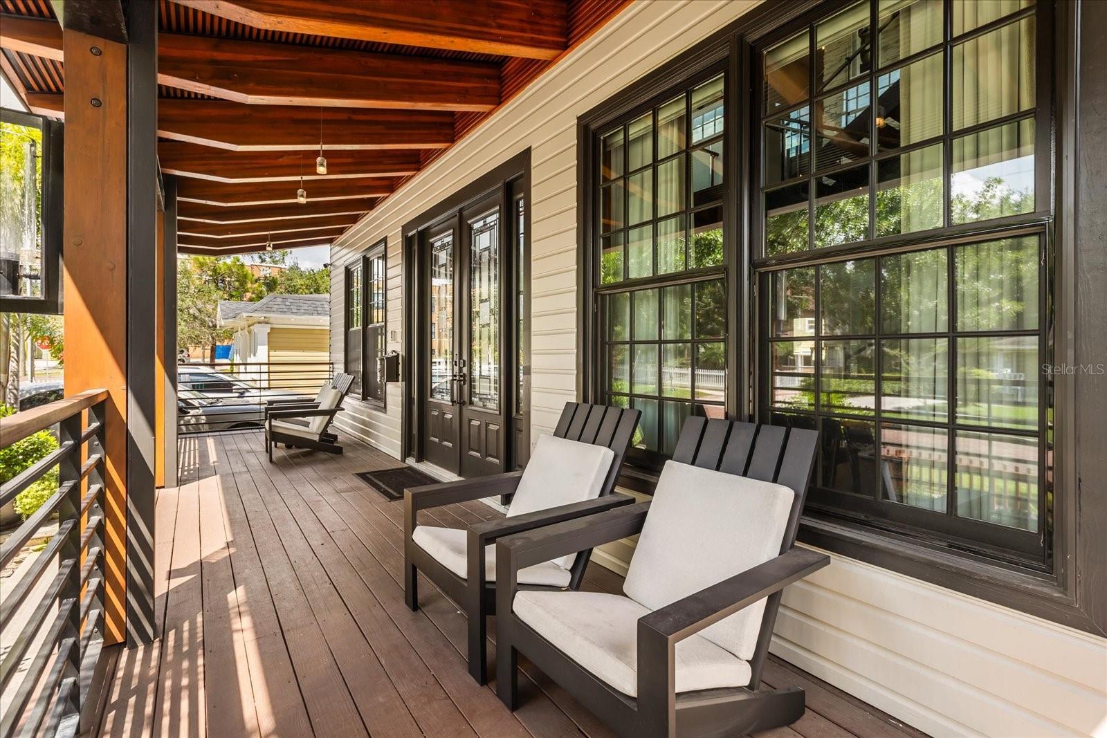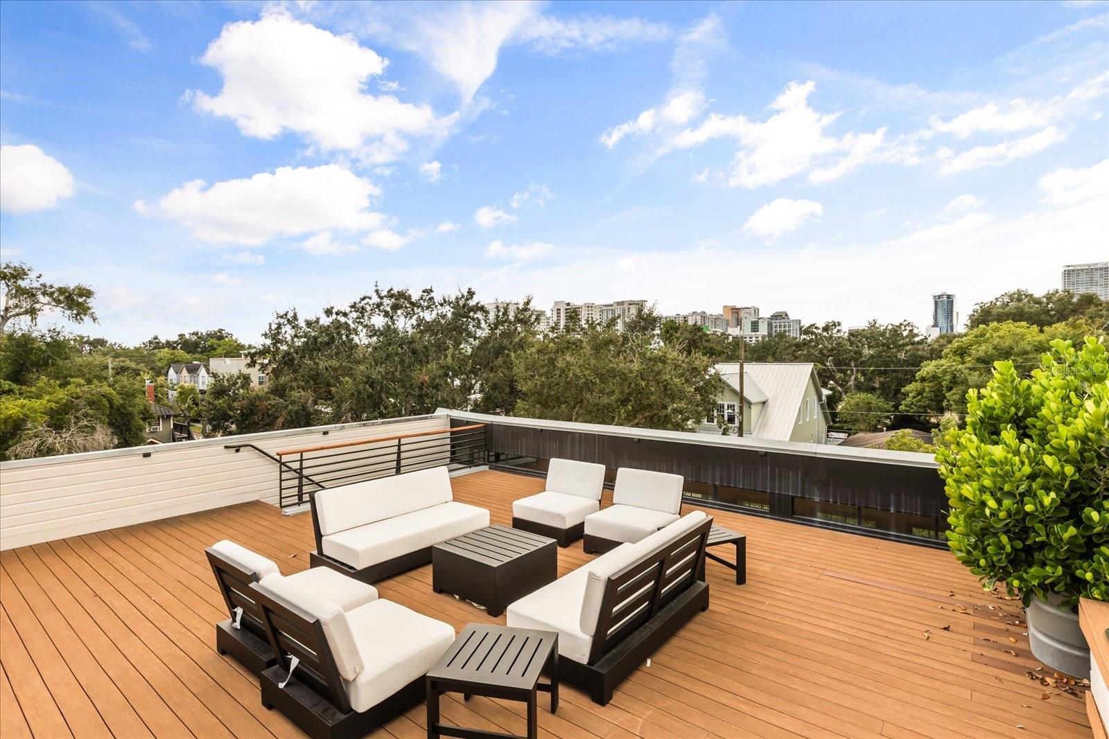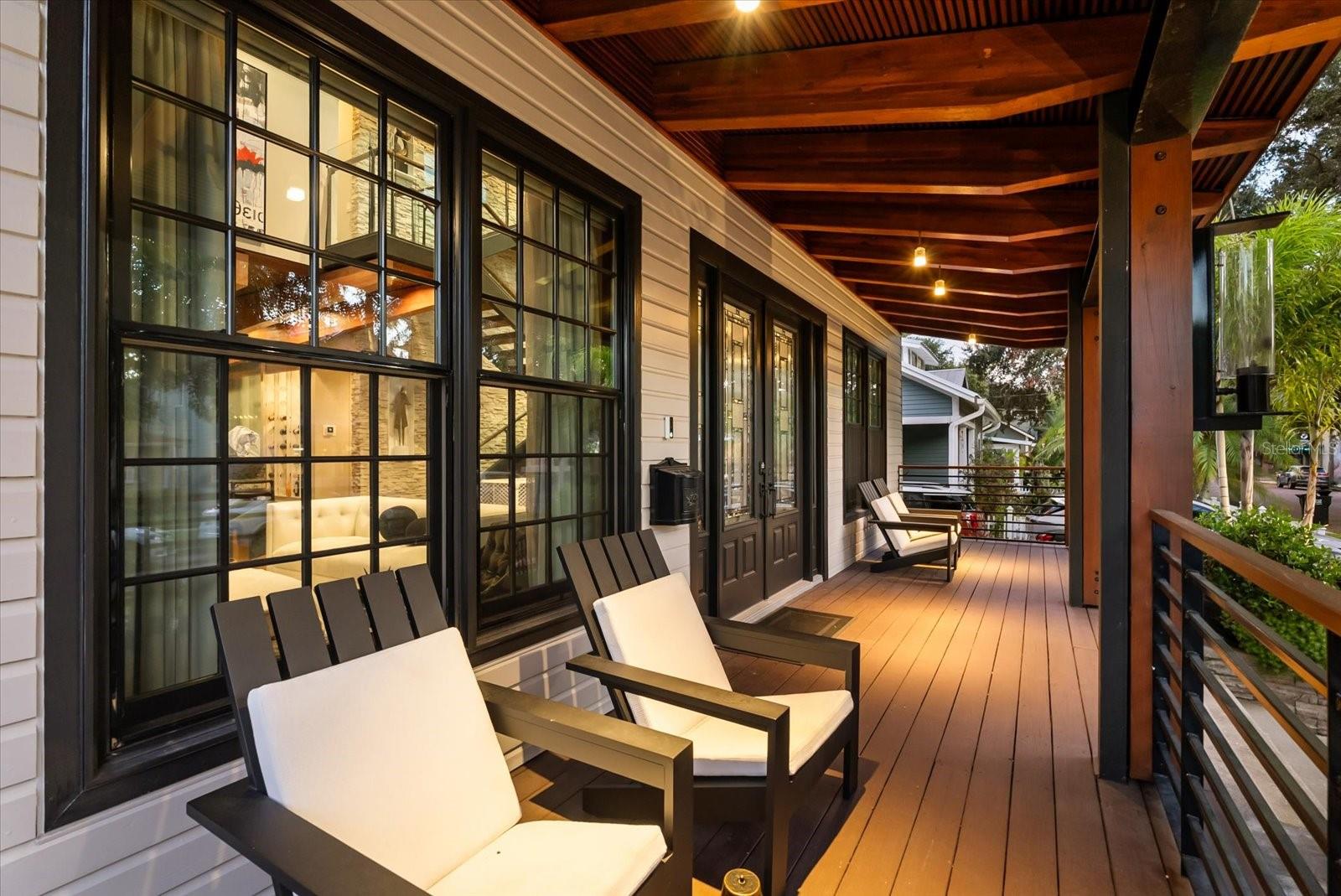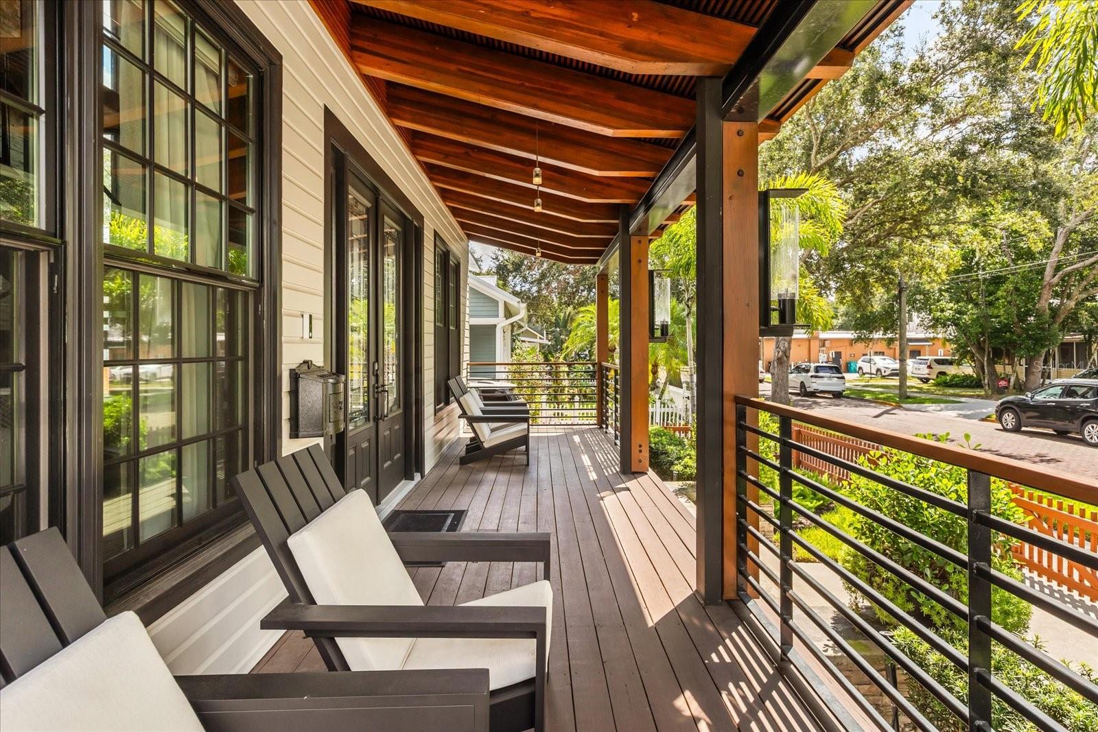 Thornton Park's best kept secret is this stunning compound's home with a total of 4-bedroom, 4.5-bath designed by renowned architect Tom Dordevic and built in 2010 as a modern interpretation of early Florida Cracker-style architecture, with newly added interior features by Winter Park’s Angela Neel. Elevated for passive cooling, the home beautifully blends historic character with contemporary design through natural materials, thoughtful proportions, and abundant natural light. Guests are welcomed by a peaceful fountain, new exterior landscaping and 35-foot-wide porch flanked by gas lanterns. Heavy Douglas Fir timber posts support exposed steel beams and roof members, showcasing exceptional craftsmanship. Inside, a dormered ceiling soars to 27 feet with a high transom window, illuminating a dramatic floating steel and glass staircase set against a 25-foot-tall stone wall. Newly refinished Oak hardwood floors through-out and exposed wood rafters create warmth and a sense of spaciousness throughout. The main home’s 3, 528-square-foot floor plan features a chef’s island kitchen, wine bottle wall, a great room with fireplace, and a versatile and hidden den/office/media space with a glass/ metal privacy door. Entertain in the elegant dining area highlighted by the floating staircase. Upstairs, the serene primary suite offers a spa-like bath, custom walk-in closet and a balcony complemented by two additional generously sized bedroom suites. Step outside to the back and enjoy an over-sized porch and outdoor overlooking the newly fenced private backyard or ascend to the expansive rooftop deck with unparalleled downtown Orlando skyline views. A detached air conditioned three-car garage with pebble tech flooring, and EV charging includes a 1-bedroom, 1-bath detached guest suite at 726 square feet has a full kitchen, washer/ dryer, full bathroom and balcony—perfect for visitors or rental income. Located in the heart of the walkable Thornton Park District, just blocks from downtown Orlando’s dining, entertainment, Dr. Phillips Center, and The Kia Center, with easy access to major roadways, Orlando International Airport, hospitals, and world-famous theme parks. The owner has invested over $330, 000 in improvements including and not limited to 26 new custom windows, new fencing and brand-new HVACs in the main home over the past year. Don’t miss this rare opportunity to own a sophisticated home in one of Orlando’s most sought-after neighborhoods. See attached owner improvements sheet for details and more information. And call for your private showing today.