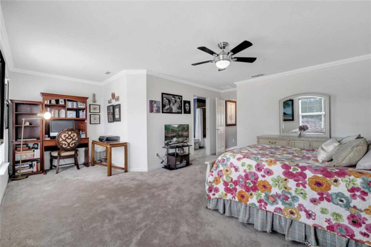 Ceiling Fans(s), Crown Molding, Eat-in Kitchen, High Ceilings, Living Room/Dining Room Combo, Open Floorplan, PrimaryBedroom Upstairs, Solid Surface Counters, Stone Counters, Thermostat, Walk-In Closet(s)