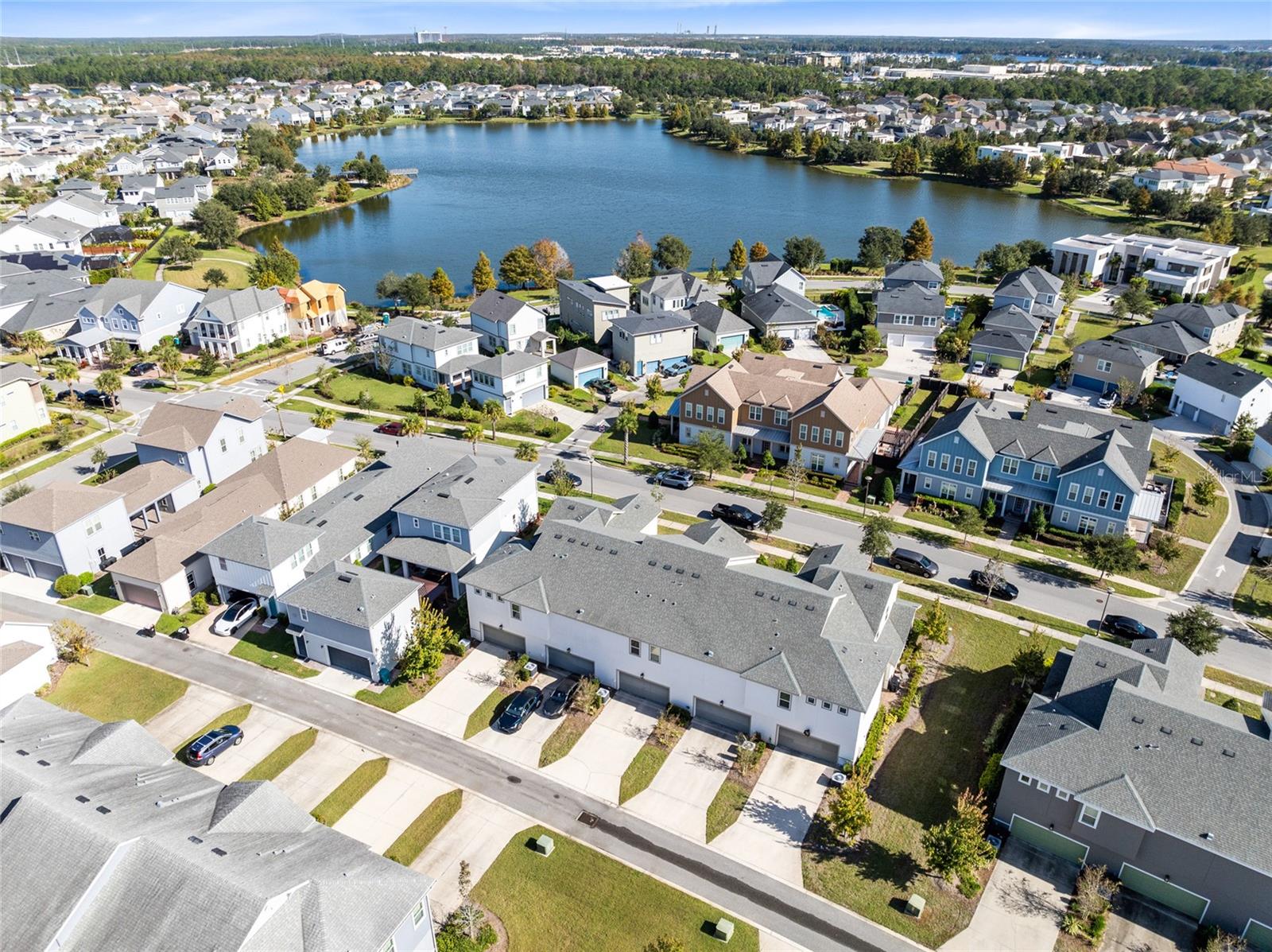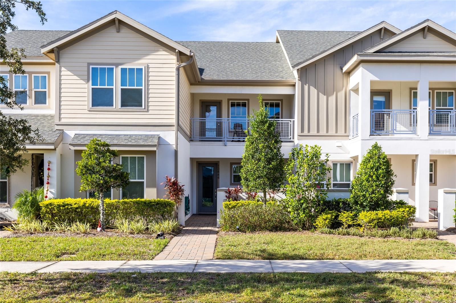 Welcome to this beautifully designed townhome in the highly desirable Laureate Park community of Lake Nona. Built in 2020, this contemporary residence offers over 1, 600 sq. ft. of modern living, featuring 2 bedrooms, 2 bathrooms, and a spacious 2-car garage. The inviting front porch and overhead balcony create the perfect spot to relax or entertain. Inside, hardwood stairs lead you to a bright, open-concept living area where the living room, dining room, and kitchen flow effortlessly together. The kitchen stands out with sleek stainless-steel appliances, solid stone countertops, and a large island ideal for gatherings. Both bedrooms feature ceramic tile flooring, ceiling fans, blinds, and pre-installed TV mounts. The primary suite offers a walk-in shower, double-sink vanity, and a generous walk-in closet, creating a comfortable and private retreat. Life in Laureate Park brings the best of modern living and natural beauty. This master-planned community offers tree-lined streets, scenic parks, and exceptional amenities, including resort-style pools, fitness centers, and vibrant social spaces. You’re minutes from top-rated schools, Orlando International Airport, and premier wellness and recreation hubs such as the Lake Nona Performance Club, USTA National Campus, Drive Shack, and Nona Adventure Park. World-class medical facilities—Nemours Children’s Hospital, the VA Hospital, UCF College of Medicine, and UCF Lake Nona Hospital—add unbeatable convenience. Laureate Park blends comfort, community, and lifestyle, making this townhome an ideal place to call home.