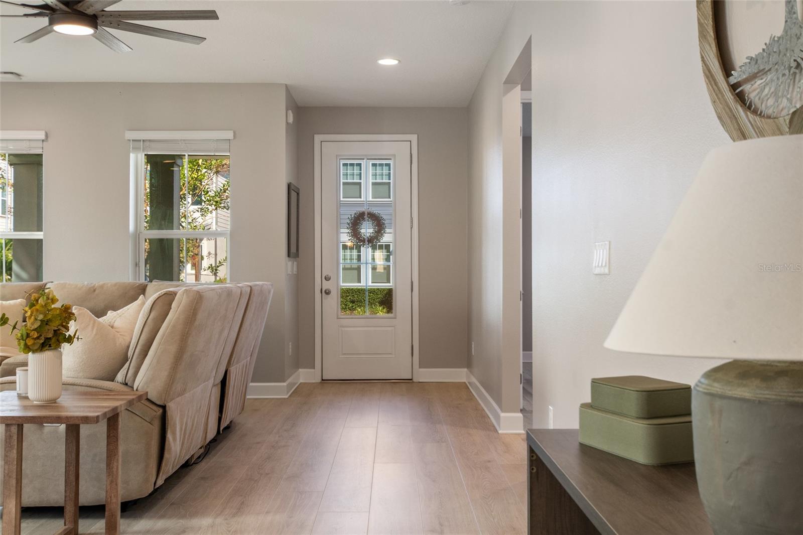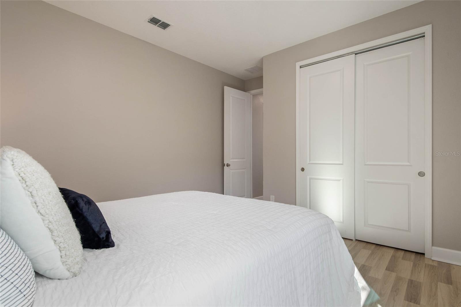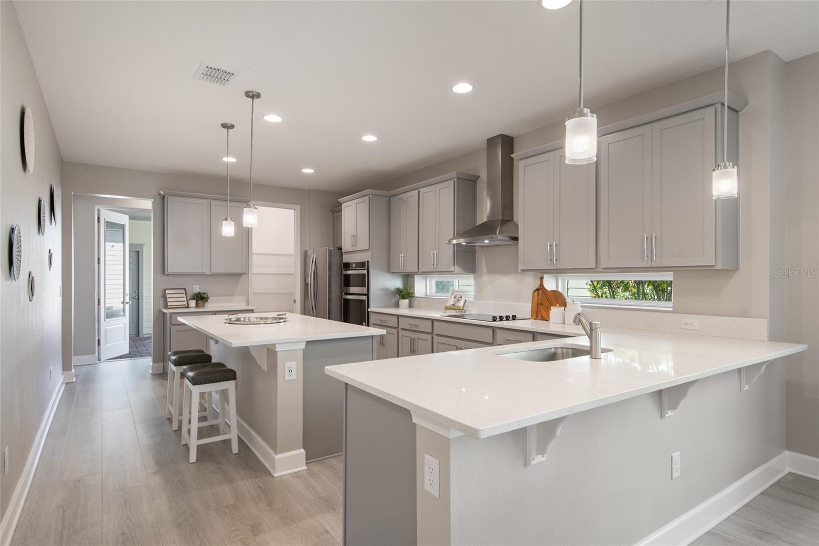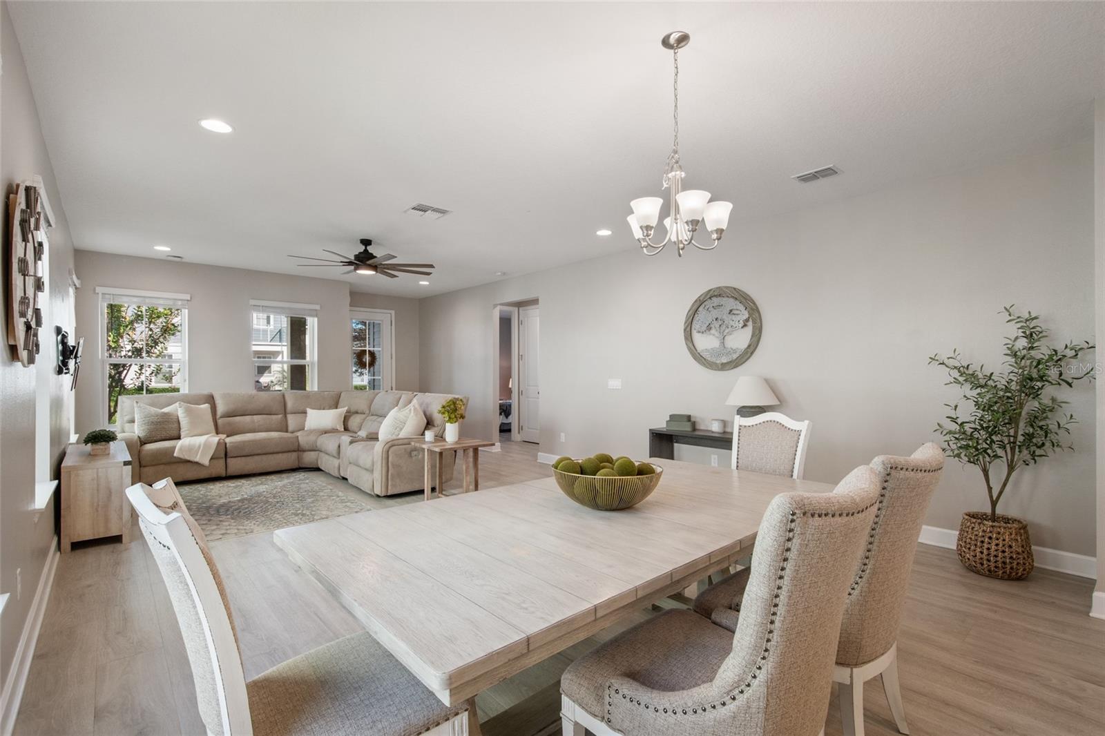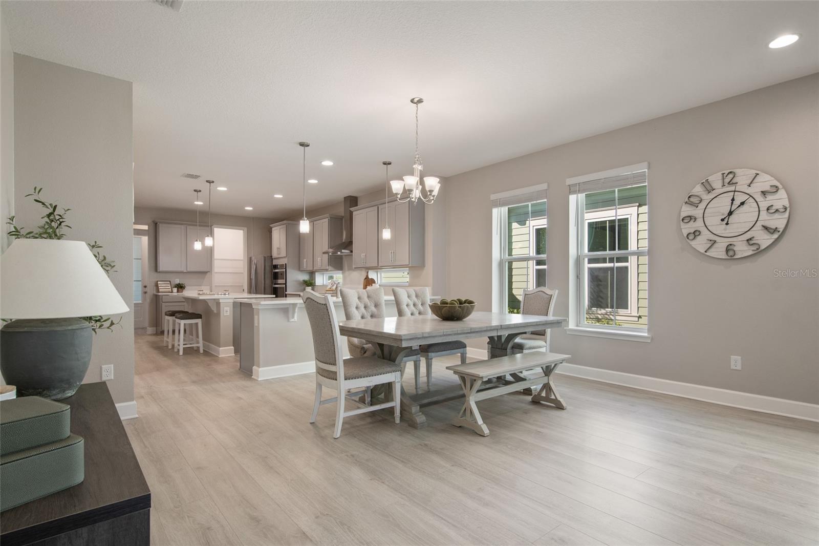 Under contract-accepting backup offers. Welcome Home! This charming, beautiful, and meticulously maintained single-story home offers amazing curb appeal and is perfectly situated on a Mews Lot in the highly desirable community of Laureate Park in Lake Nona, Orlando, FL. Enjoy quiet mornings with a cup of coffee or unwind with a good book on your quaint front porch overlooking the lush, manicured greenspace. Step inside to a welcoming foyer featuring luxury vinyl plank flooring that flows seamlessly throughout the main living areas. Experience the comfort of an open-concept floor plan that includes a family room, dining area, and kitchen combination. Your spacious family and dining rooms are bathed in natural light from surrounding windows—creating the perfect atmosphere to relax and reconnect after a long day. Adjacent to the family room, you’ll find a full bathroom and two inviting bedrooms. Down the hall lies the heart of the home—your bright, spacious, and stunning kitchen. Cook with ease in your gourmet kitchen, offering ample counter space, a single basin sink, quartz countertops, stainless steel appliances, shaker-style cabinetry, and premium upgrades such as cabinet drawer systems, pull-out trash bins, under-cabinet lighting, and a walk-in pantry. Tucked away off the kitchen is your oversized master bedroom featuring an ensuite bathroom with a large walk-in shower showcasing floor-to-ceiling tile and a rain shower head. The elegant double-sink vanity with quartz countertops provides abundant storage, and the expansive walk-in closet completes this serene retreat. Conveniently located off the kitchen, your walk-in laundry room has been upgraded with upper cabinetry for extra organization. At the back of the home, you’ll appreciate the built-in insert area—perfect for creating a custom drop zone to simplify daily comings and goings. Step outside to your rear covered and screened-in porch, ideal for enjoying Florida’s beautiful weather all year long. Additional upgrades include speaker pre-wiring in the great room and lanai, pre-plumbing for an outdoor kitchen, HVAC UV System, and a whole-home filtration and alkaline system, along with a Water Softener. The HOA includes high-speed internet (up to 1 GIG) and access to the Laureate Park Fitness Center, resort-style aquatic center, beach volleyball court, and half basketball court. Laureate Park also features community gardens, dog parks, playgrounds, and miles of scenic trails for walking, running, and biking. Enjoy a vibrant community lifestyle with events like Live & Local, Movies in the Park, Yoga, and more. Located in the heart of Lake Nona’s Medical City, with convenient access to the BEEP autonomous shuttle service, this home is near top-rated schools, Orlando International Airport, major highways, shopping, dining, the USTA National Campus, and KPMG.