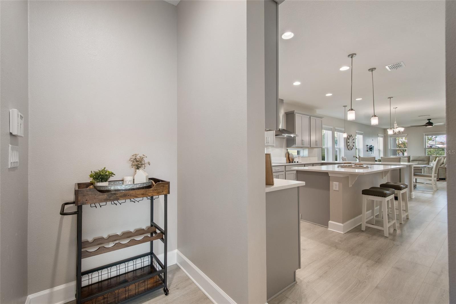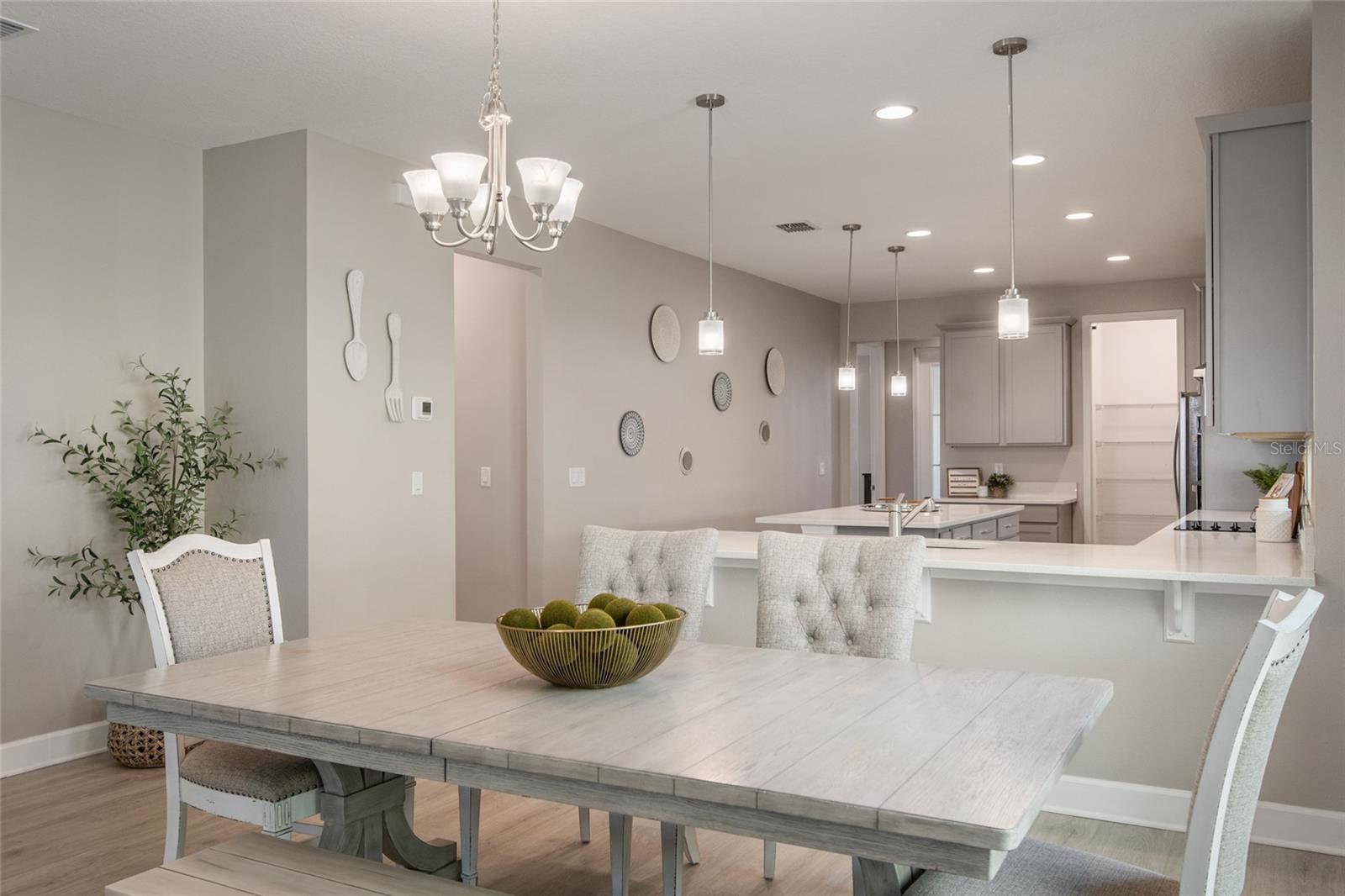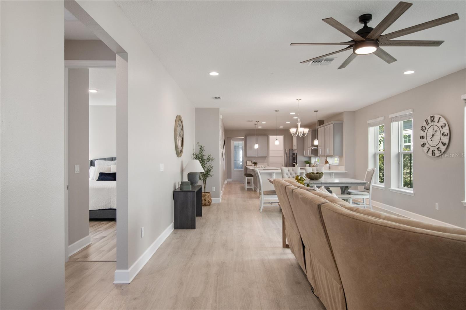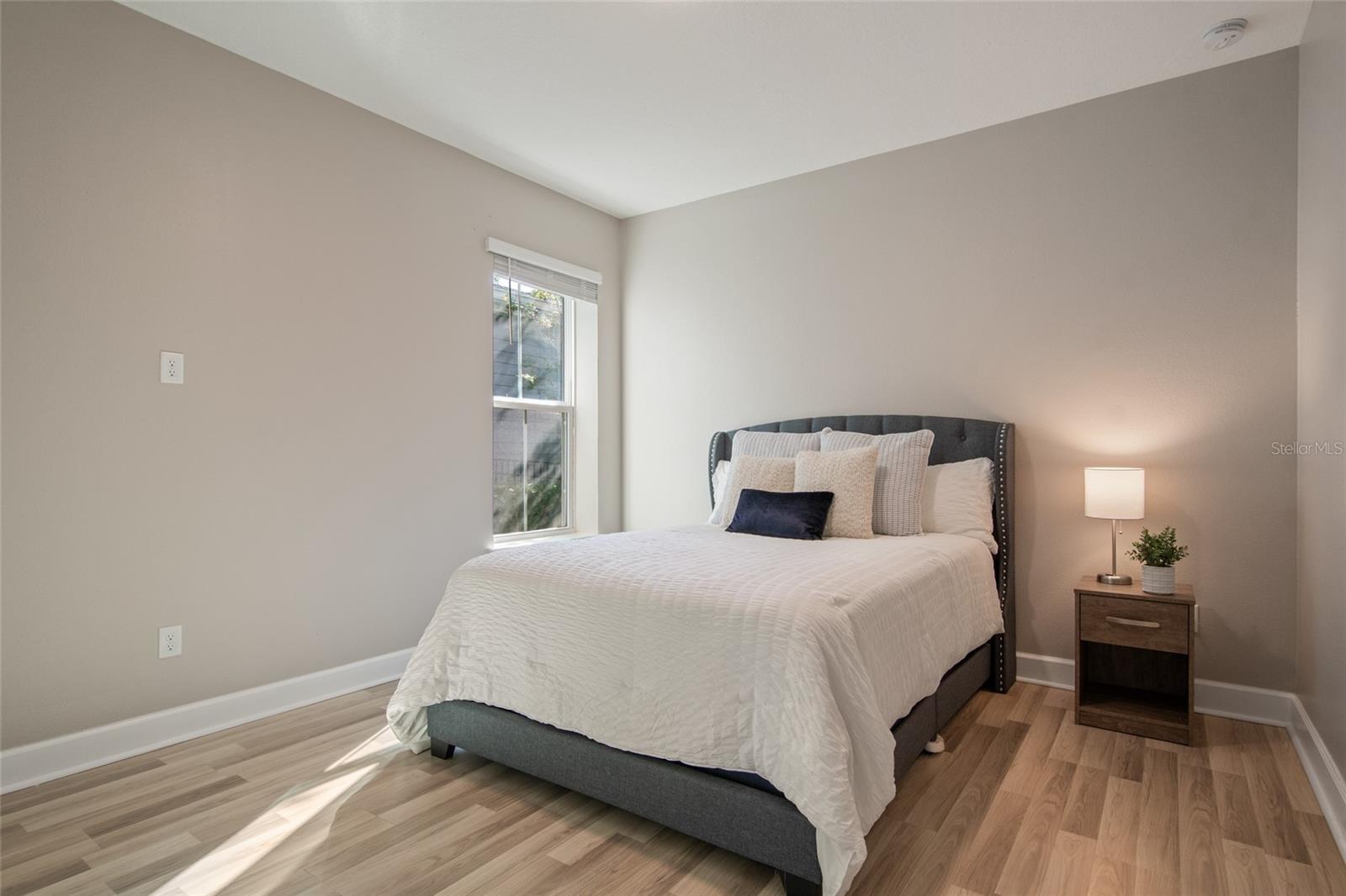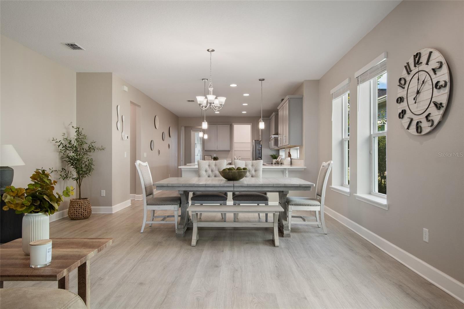 Under contract-accepting backup offers. Welcome Home! This charming, beautiful, and meticulously maintained single-story home offers amazing curb appeal and is perfectly situated on a Mews Lot in the highly desirable community of Laureate Park in Lake Nona, Orlando, FL. Enjoy quiet mornings with a cup of coffee or unwind with a good book on your quaint front porch overlooking the lush, manicured greenspace. Step inside to a welcoming foyer featuring luxury vinyl plank flooring that flows seamlessly throughout the main living areas. Experience the comfort of an open-concept floor plan that includes a family room, dining area, and kitchen combination. Your spacious family and dining rooms are bathed in natural light from surrounding windows—creating the perfect atmosphere to relax and reconnect after a long day. Adjacent to the family room, you’ll find a full bathroom and two inviting bedrooms. Down the hall lies the heart of the home—your bright, spacious, and stunning kitchen. Cook with ease in your gourmet kitchen, offering ample counter space, a single basin sink, quartz countertops, stainless steel appliances, shaker-style cabinetry, and premium upgrades such as cabinet drawer systems, pull-out trash bins, under-cabinet lighting, and a walk-in pantry. Tucked away off the kitchen is your oversized master bedroom featuring an ensuite bathroom with a large walk-in shower showcasing floor-to-ceiling tile and a rain shower head. The elegant double-sink vanity with quartz countertops provides abundant storage, and the expansive walk-in closet completes this serene retreat. Conveniently located off the kitchen, your walk-in laundry room has been upgraded with upper cabinetry for extra organization. At the back of the home, you’ll appreciate the built-in insert area—perfect for creating a custom drop zone to simplify daily comings and goings. Step outside to your rear covered and screened-in porch, ideal for enjoying Florida’s beautiful weather all year long. Additional upgrades include speaker pre-wiring in the great room and lanai, pre-plumbing for an outdoor kitchen, HVAC UV System, and a whole-home filtration and alkaline system, along with a Water Softener. The HOA includes high-speed internet (up to 1 GIG) and access to the Laureate Park Fitness Center, resort-style aquatic center, beach volleyball court, and half basketball court. Laureate Park also features community gardens, dog parks, playgrounds, and miles of scenic trails for walking, running, and biking. Enjoy a vibrant community lifestyle with events like Live & Local, Movies in the Park, Yoga, and more. Located in the heart of Lake Nona’s Medical City, with convenient access to the BEEP autonomous shuttle service, this home is near top-rated schools, Orlando International Airport, major highways, shopping, dining, the USTA National Campus, and KPMG.