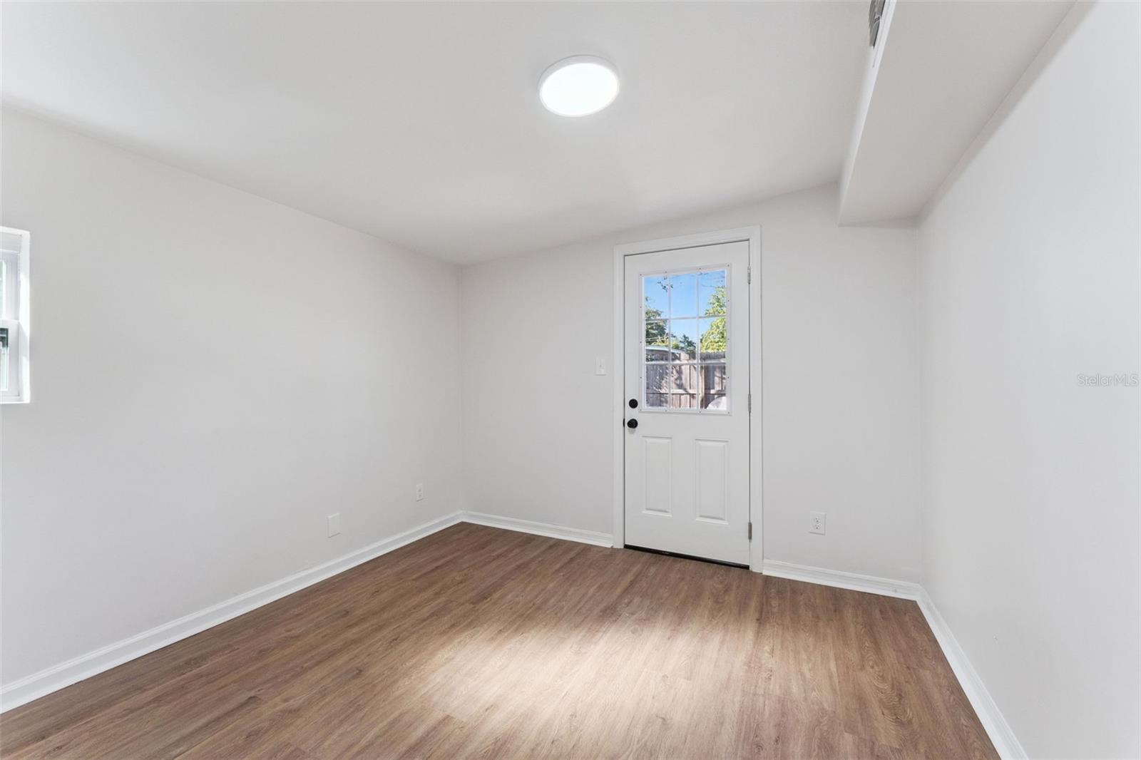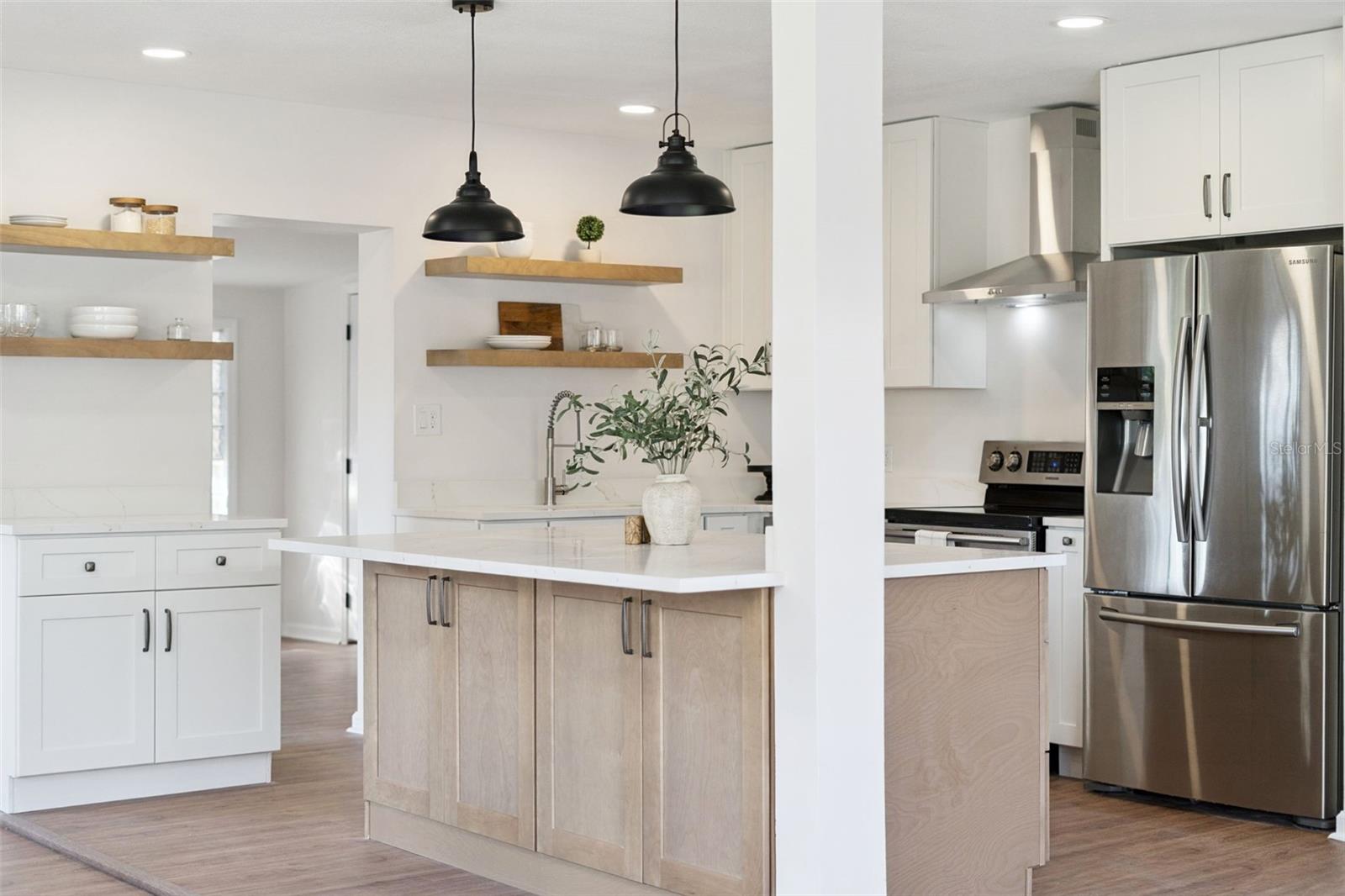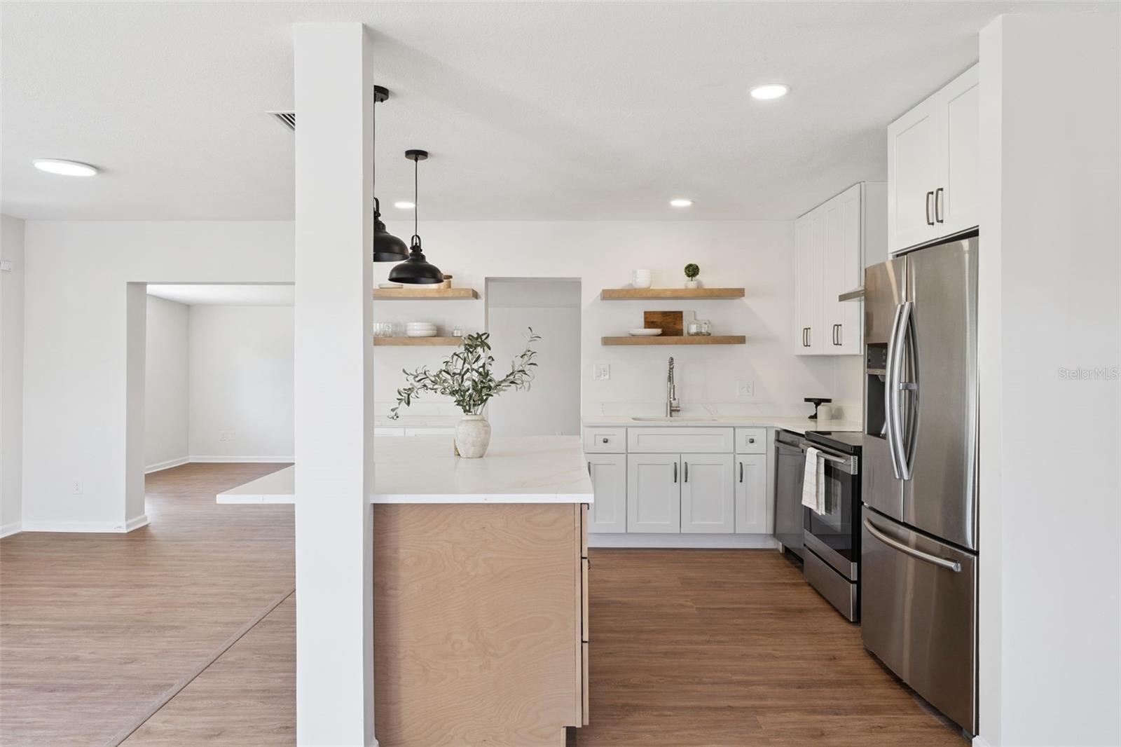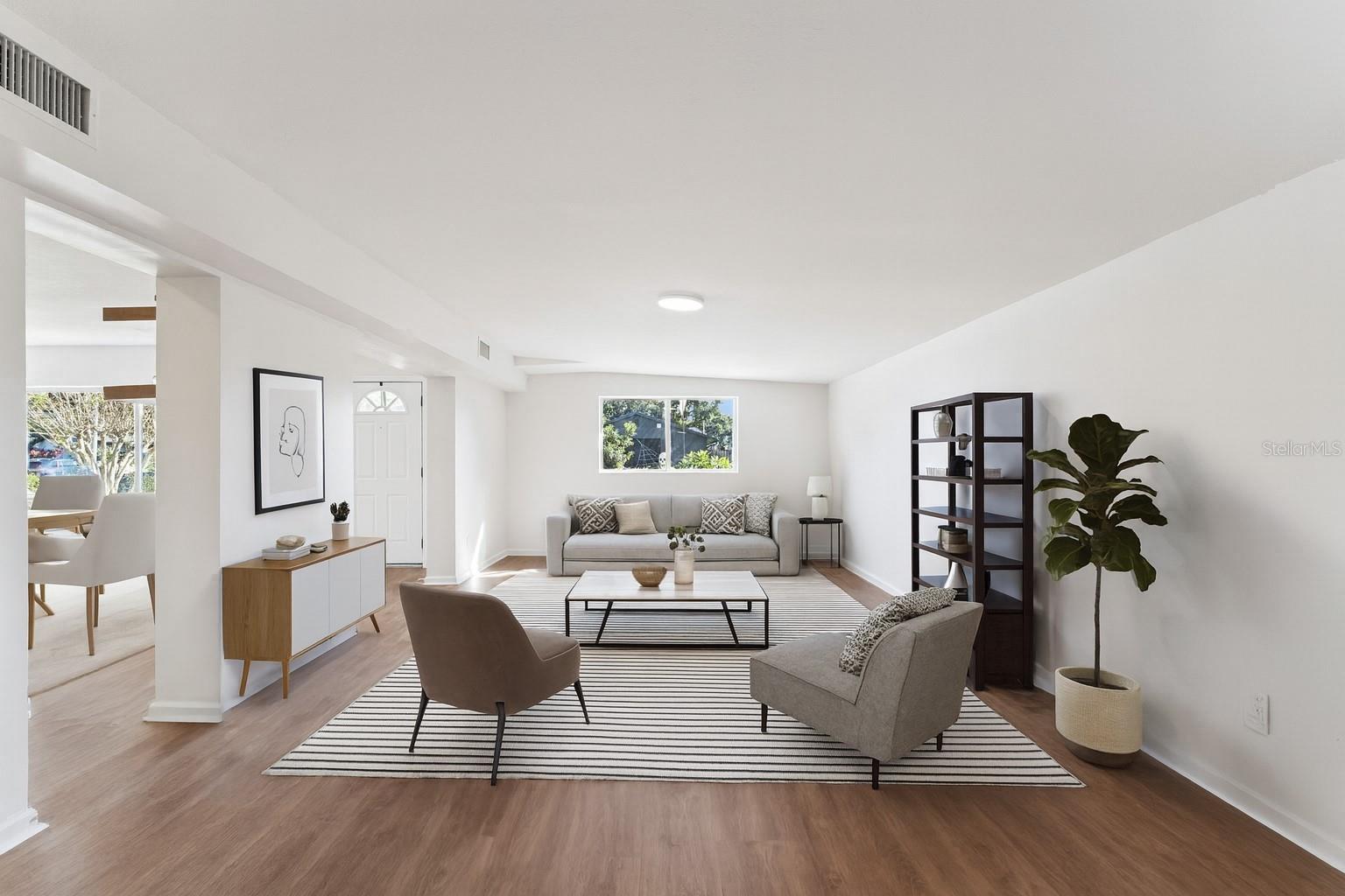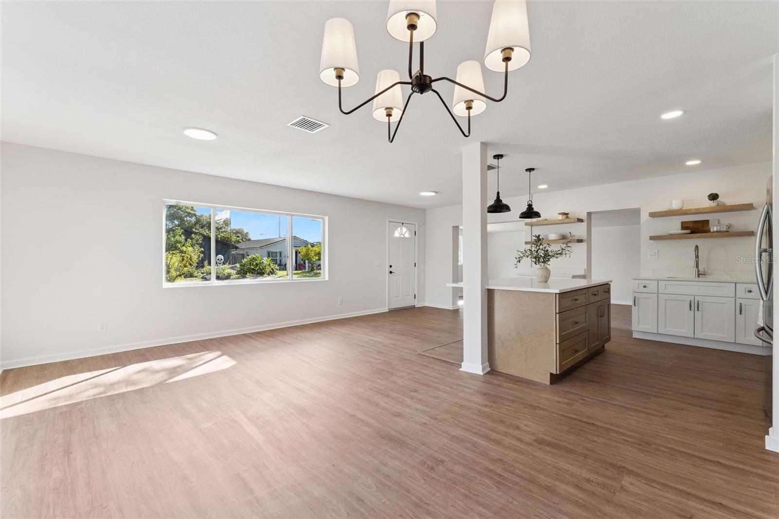 One or more photo(s) has been virtually staged. Completely remodeled 4-bedroom home in the heart of College Park! This Mid-Century Modern gem has been fully updated from top to bottom, featuring a new permitted roof, new HVAC, updated plumbing and electrical, new energy-efficient water heater, stainless steel appliances, soft-close cabinets, a large kitchen island, fresh landscaping, and more. Every detail has been thoughtfully designed for comfort, efficiency, and style. Step inside to discover a Modern Contemporary interior with an open-concept layout, luxury vinyl plank flooring, fresh interior and exterior paint, and designer lighting throughout. The chef’s kitchen boasts quartz countertops, custom soft-close cabinetry, floating wood shelves, stainless steel appliances, and a large island perfect for entertaining. The private owner’s suite offers a spa-inspired bathroom with an extended tiled frameless glass shower and walk-in closet. Two additional bedrooms share a beautifully updated full bath featuring custom built-in wood shelves, while the fourth room serves perfectly as an office, studio, playroom, or guest suite. Enjoy outdoor living on the rear patio, complete with a cozy firepit and a fully fenced backyard ideal for relaxing or hosting gatherings. Situated just minutes from Edgewater Drive’s shops and dining, Dubsdread Golf Course, Lake Ivanhoe, and Downtown Orlando, this home perfectly blends modern luxury with classic College Park charm. Located only a few houses down from the light-use rail corridor along N Orange Blossom Trail, the nearby transfer station experiences minimal activity, maintaining the peaceful neighborhood atmosphere that makes College Park so desirable.