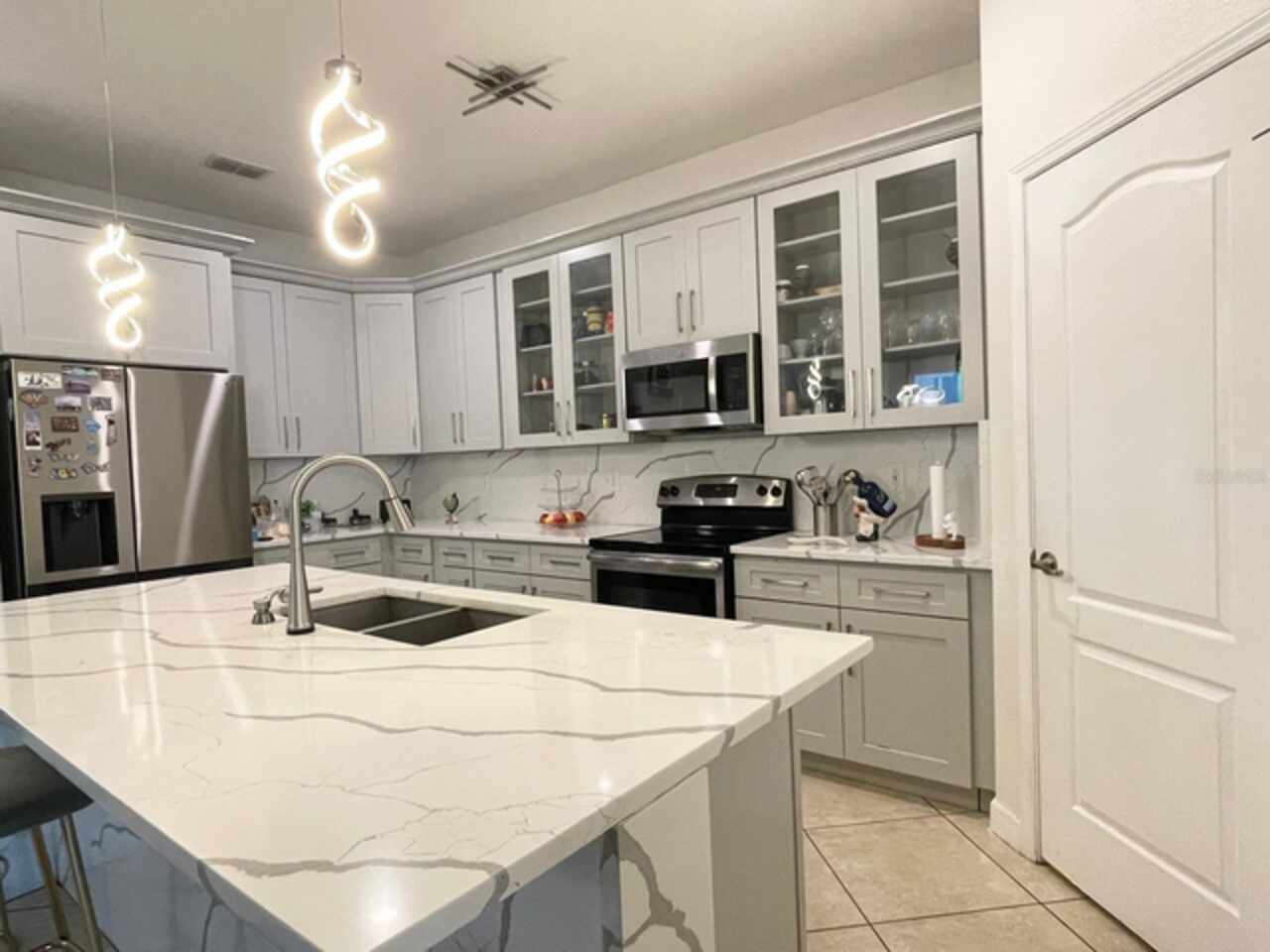 This stunning 4-bedroom, 3-bathroom home with a 2-car garage offers 2, 027 sq. ft. of beautifully updated living space. As you enter, you’re greeted by a spacious hallway that opens into a large, open-concept living and dining area, where sliding glass doors frame breathtaking lake view. The heart of this home is the kitchen and it is a true highlight, features new cabinetry, elegant quartz countertops and matching quartz backsplash, combining style and functionality in a modern design. All bedrooms feature sleek vinyl flooring- no carpet throughout the home. Step outside to the covered lanai in the backyard, an ideal retreat for relaxing after a long day while soaking in serene waterfront views. The community offers a huge pool, clubhouse with fitness center, tennis courts and basketball. The location is key, just minutes from Lake Nona and Medical City and the Orlando International Airport, easy access to the 417 and SR 528, restaurants, schools, theme parks and East coast beaches. Don’t miss this exceptional opportunity to own a lakefront home in a desirable Orlando location!