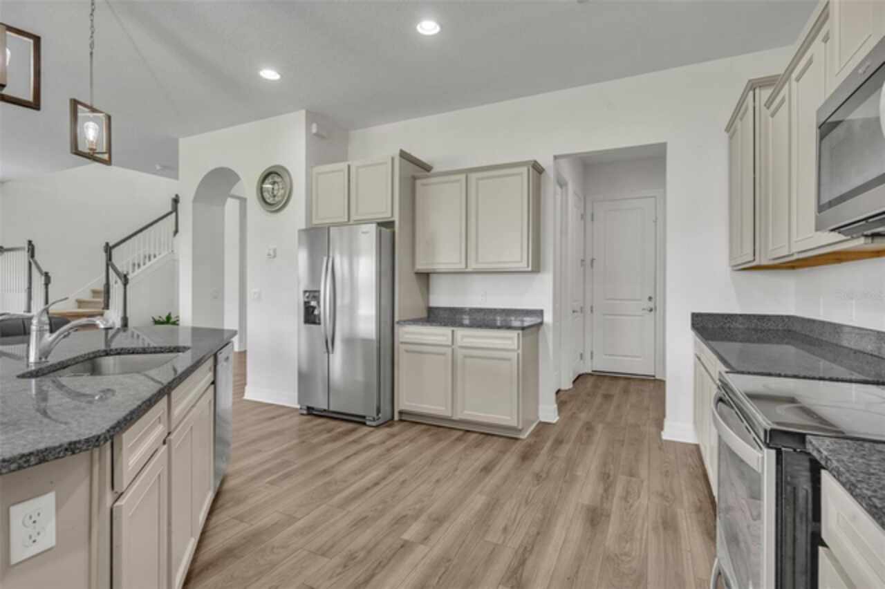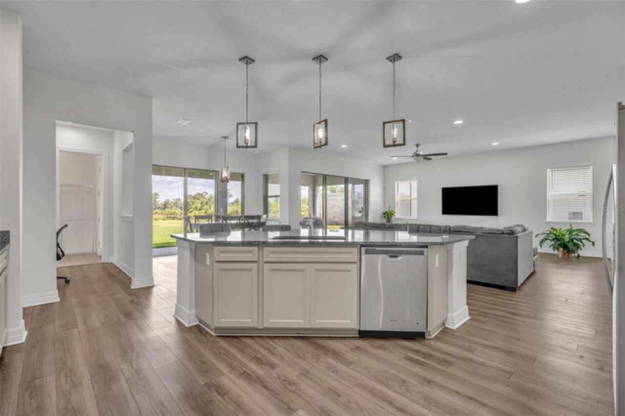 Ceiling Fans(s), Eat-in Kitchen, High Ceilings, Kitchen/Family Room Combo, Living Room/Dining Room Combo, Open Floorplan, Primary Bedroom Main Floor, Solid Surface Counters, Solid Wood Cabinets, Thermostat, Walk-In Closet(s)