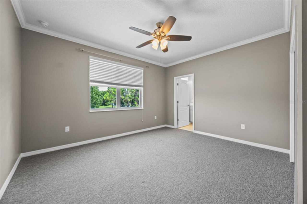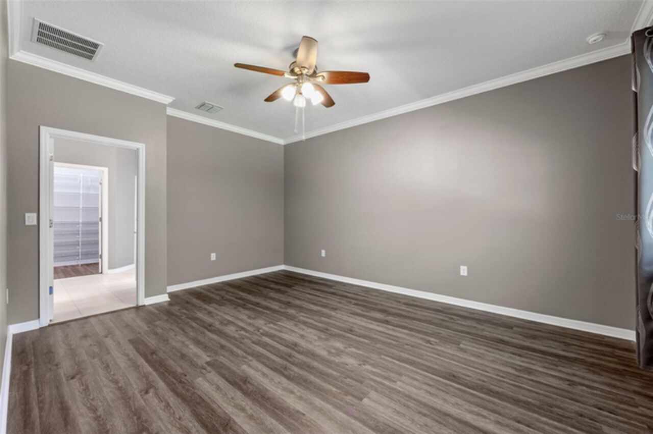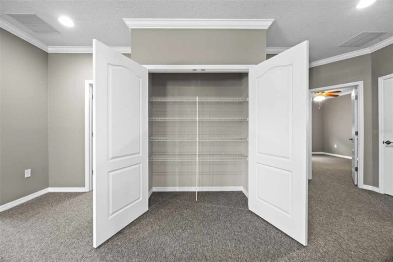 Built-in Features, Ceiling Fans(s), Crown Molding, Eat-in Kitchen, High Ceilings, Kitchen/Family Room Combo, Open Floorplan, Primary Bedroom Main Floor, Solid Wood Cabinets, Thermostat, Walk-In Closet(s)