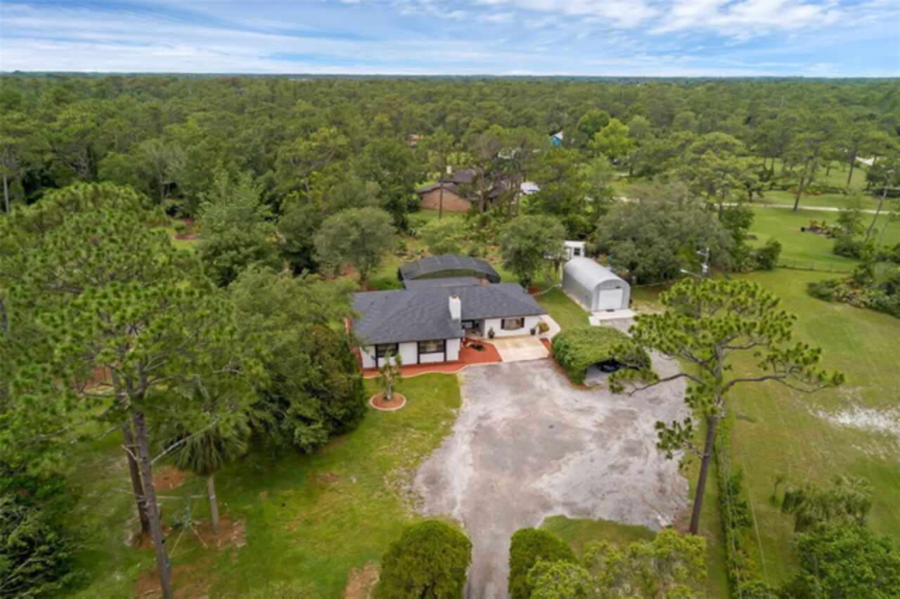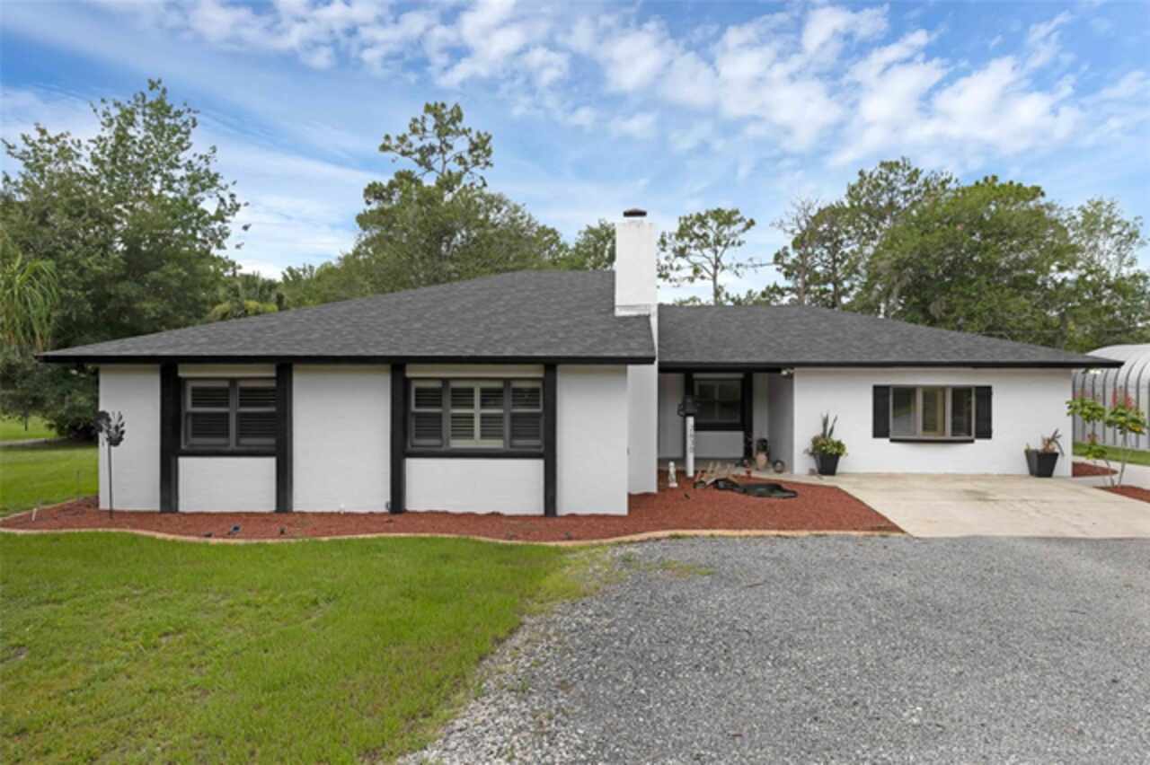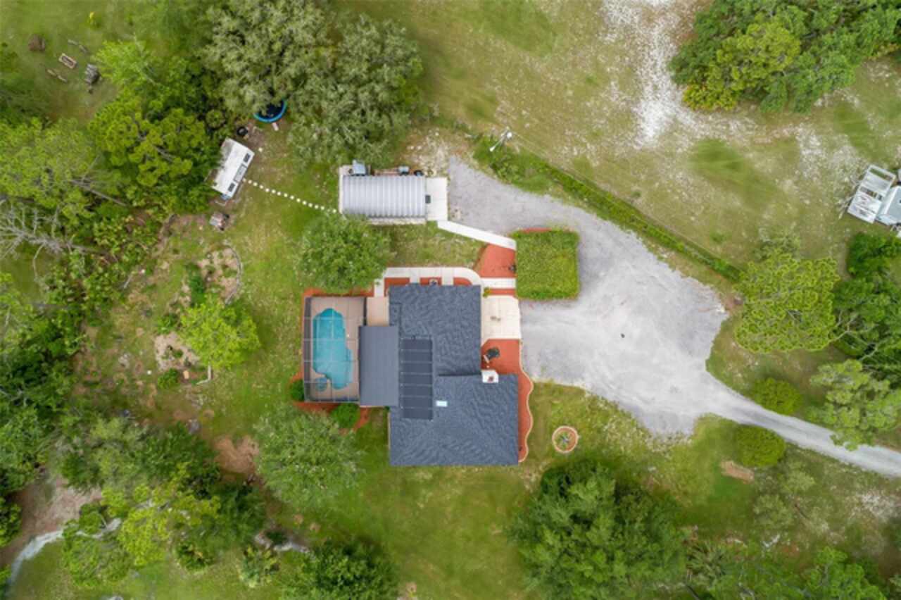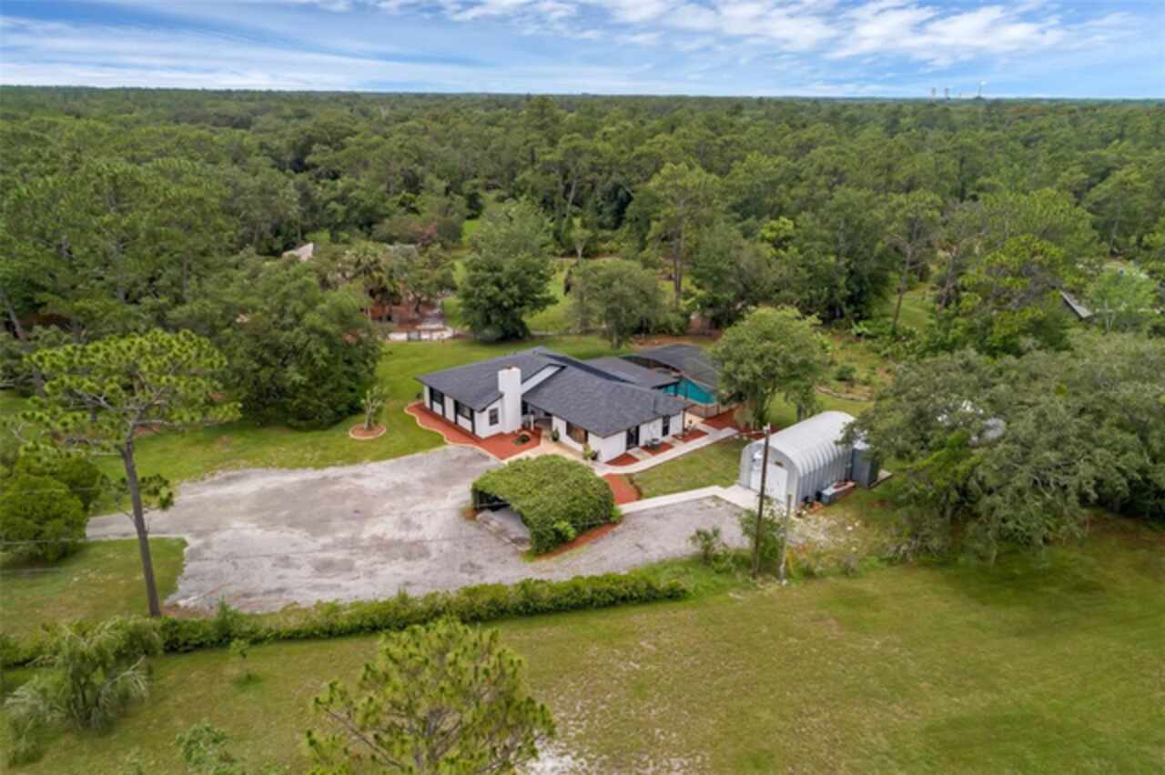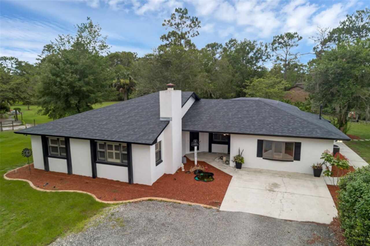PRICE IMPROVEMENT! Escape to your private 2-acre paradise—where modern updates, lush landscaping, and total freedom come together. Enjoy the best of both worlds—just minutes from UCF and downtown Orlando, and only about 45 minutes from world-famous theme parks and Florida’s beautiful beaches with NO HOA and agricultural/residential zoning that allows for chickens, livestock, RVs, and more. Inside, this beautifully renovated 4-bed, 3-bath, 2, 240 sq ft home showcases knockdown ceilings, crown molding, plantation shutters, upgraded lighting, a cozy wood-burning fireplace, and durable oversized tile and wood laminate flooring throughout. The chef’s kitchen is equally impressive, featuring a 36" Samsung WiFi-enabled gas range, Thermador double oven, oversized built-in Thermador refrigerator, and sleek granite countertops—designed for both everyday living and entertaining. Major essential updates include a new roof (2023), spray foam insulated attic, solar pool heater (2023), a deep well (2019), and remodeled kitchen and bathrooms (2020). The screened-in pool and spa—heated by 7 solar panels—are enhanced by a newly stained and sealed wood ceiling, creating a perfect year-round retreat. Surrounding the home is a flourishing food forest featuring mango, starfruit, jujube, lime, guava, avocado, mulberry, Barbados cherry, and a dozen banana varieties. A separate in-law suite with its own private entrance, full bath, and wheelchair access offers incredible versatility—ideal for multigenerational living, hosting guests, creating a private home office, or generating rental income. Additional highlights include a 2-car carport with lighting and electric, a 15’x30’ steel garage with a 2-ton A/C unit, and a powered 9’x19’ garden shed ideal for hobbies or homesteading. This one-of-a-kind property delivers privacy, versatility, and a lifestyle you won’t find in cookie-cutter communities.