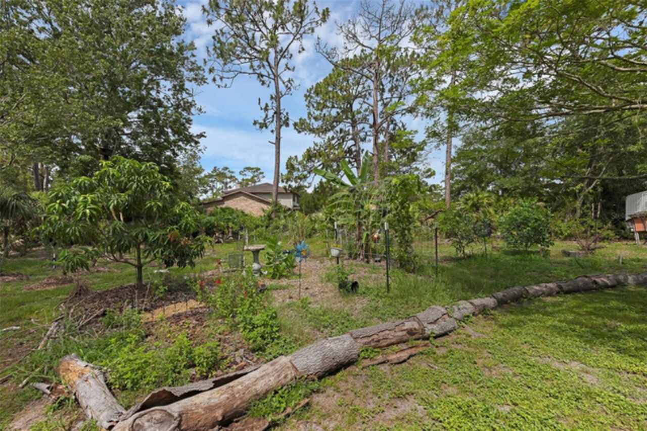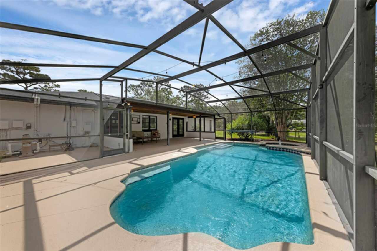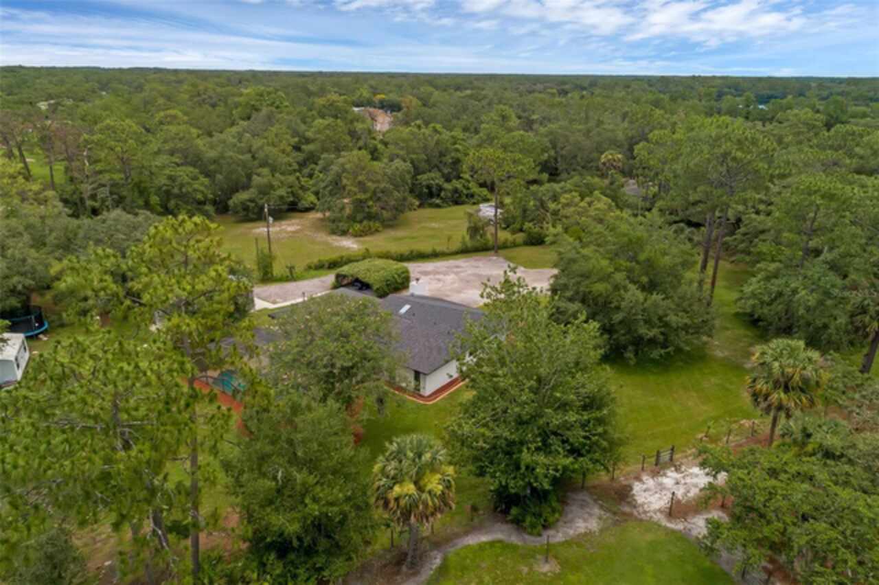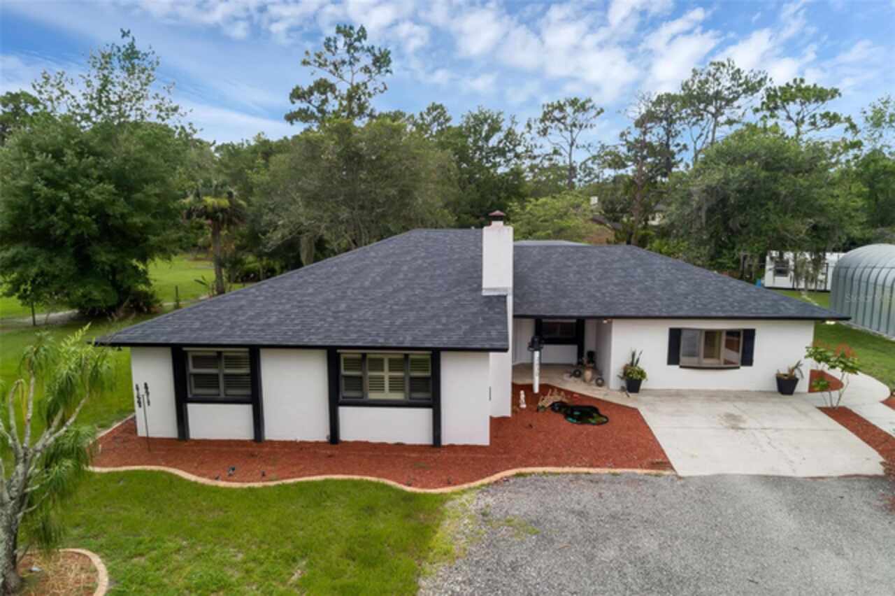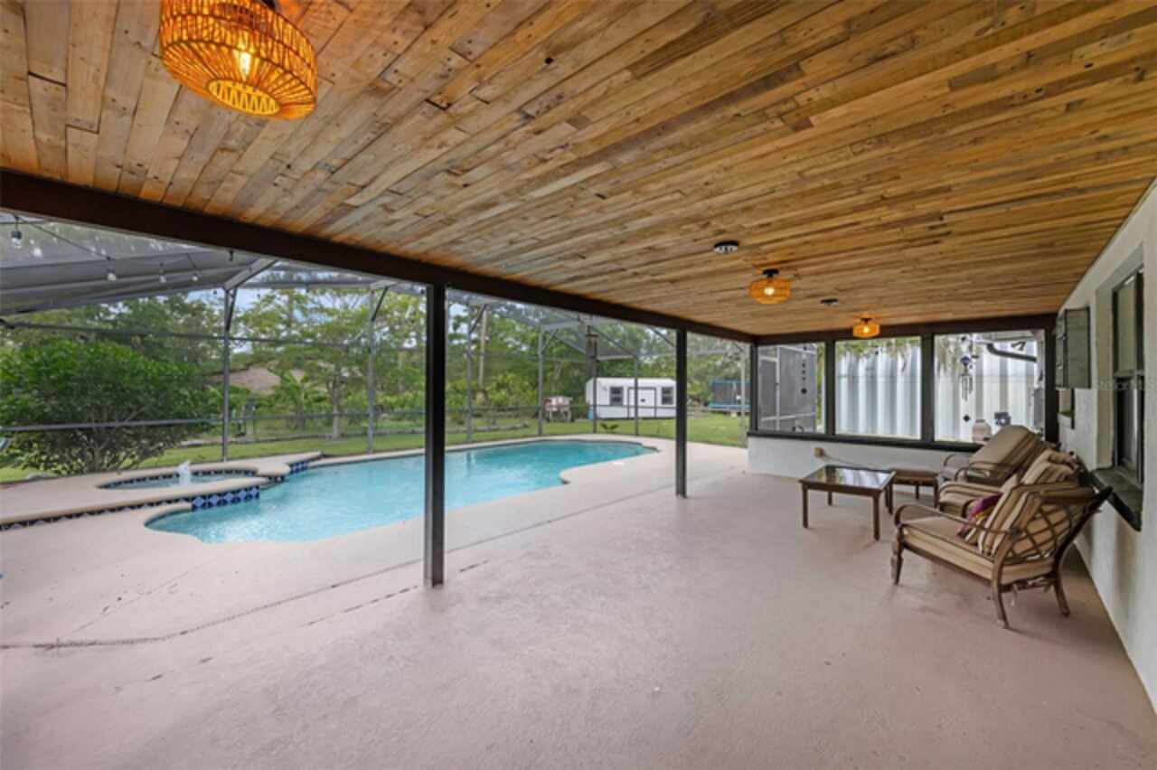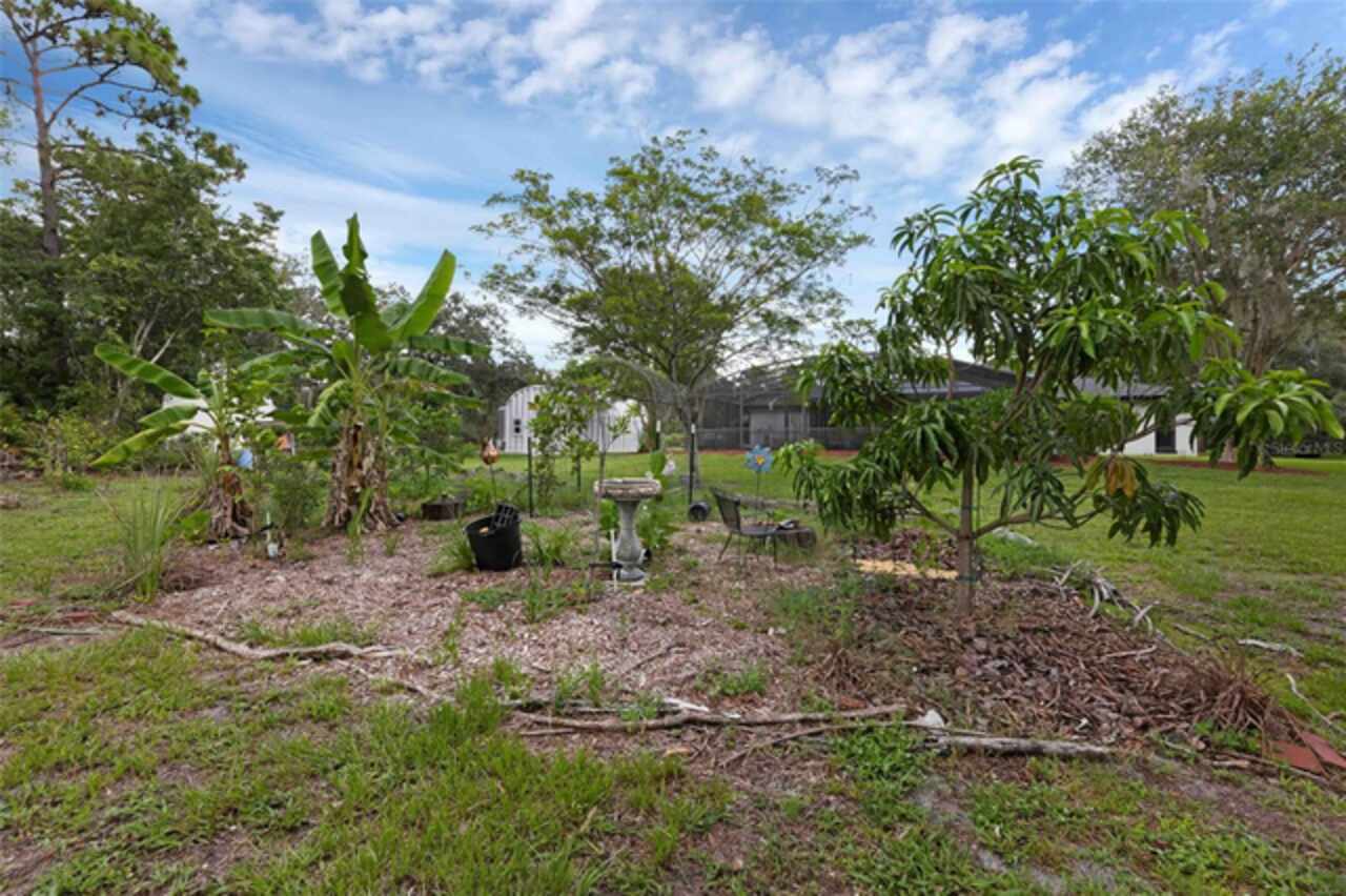 PRICE IMPROVEMENT! Escape to your private 2-acre paradise—where modern updates, lush landscaping, and total freedom come together. Enjoy the best of both worlds—just minutes from UCF and downtown Orlando, and only about 45 minutes from world-famous theme parks and Florida’s beautiful beaches with NO HOA and agricultural/residential zoning that allows for chickens, livestock, RVs, and more. Inside, this beautifully renovated 4-bed, 3-bath, 2, 240 sq ft home showcases knockdown ceilings, crown molding, plantation shutters, upgraded lighting, a cozy wood-burning fireplace, and durable oversized tile and wood laminate flooring throughout. The chef’s kitchen is equally impressive, featuring a 36" Samsung WiFi-enabled gas range, Thermador double oven, oversized built-in Thermador refrigerator, and sleek granite countertops—designed for both everyday living and entertaining. Major essential updates include a new roof (2023), spray foam insulated attic, solar pool heater (2023), a deep well (2019), and remodeled kitchen and bathrooms (2020). The screened-in pool and spa—heated by 7 solar panels—are enhanced by a newly stained and sealed wood ceiling, creating a perfect year-round retreat. Surrounding the home is a flourishing food forest featuring mango, starfruit, jujube, lime, guava, avocado, mulberry, Barbados cherry, and a dozen banana varieties. A separate in-law suite with its own private entrance, full bath, and wheelchair access offers incredible versatility—ideal for multigenerational living, hosting guests, creating a private home office, or generating rental income. Additional highlights include a 2-car carport with lighting and electric, a 15’x30’ steel garage with a 2-ton A/C unit, and a powered 9’x19’ garden shed ideal for hobbies or homesteading. This one-of-a-kind property delivers privacy, versatility, and a lifestyle you won’t find in cookie-cutter communities.
