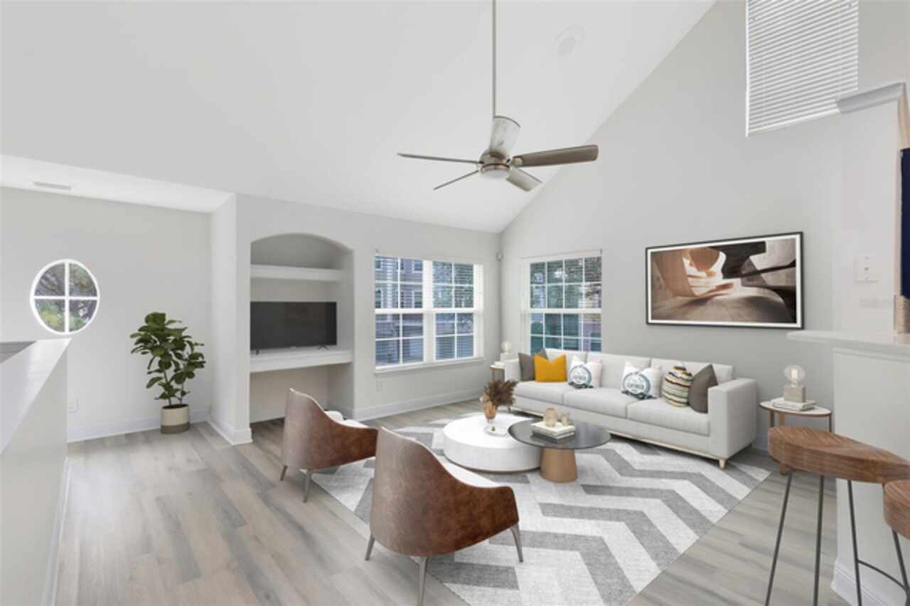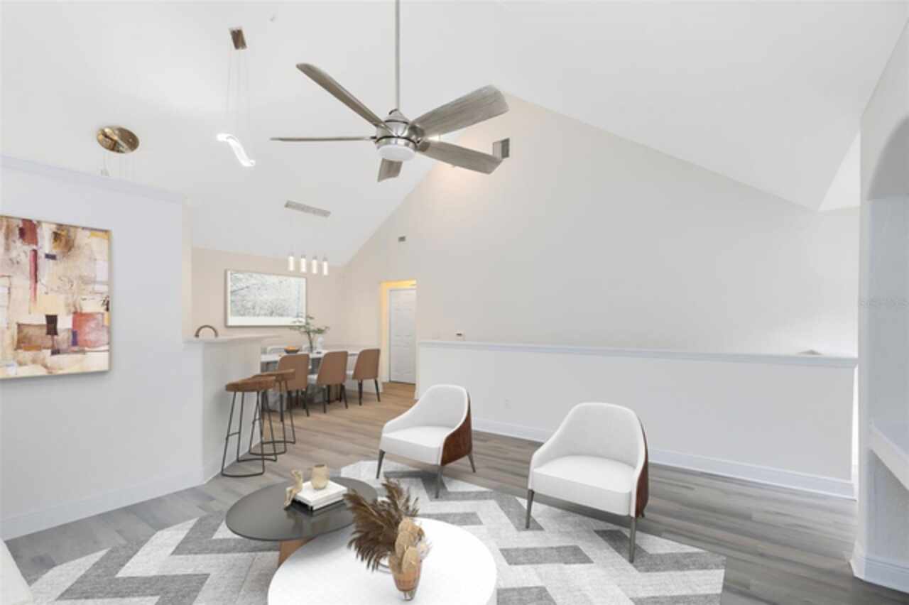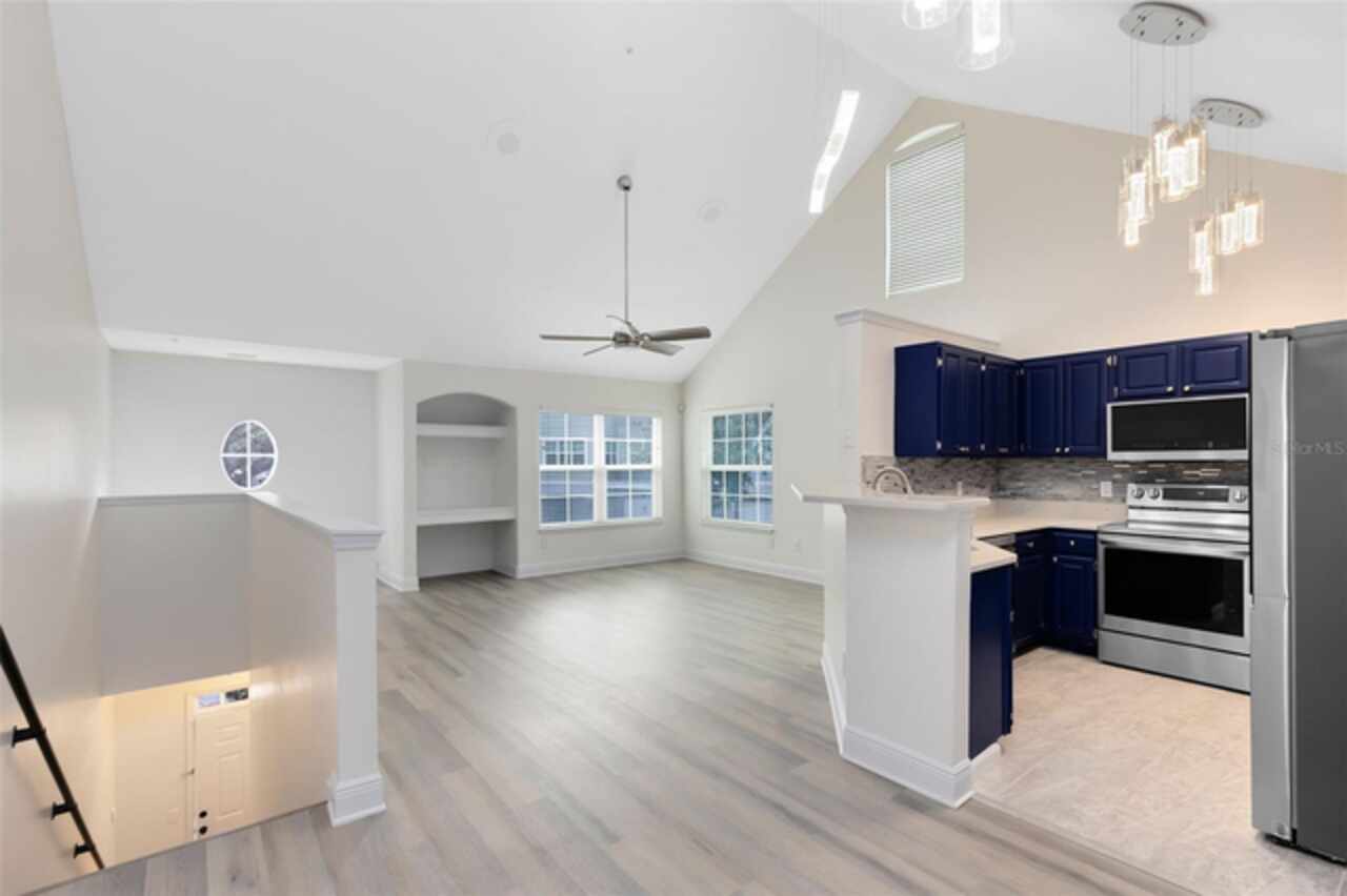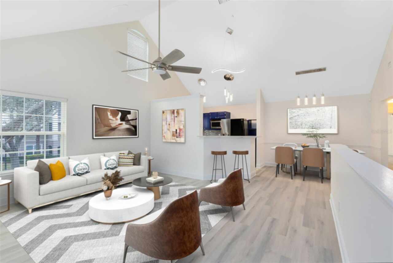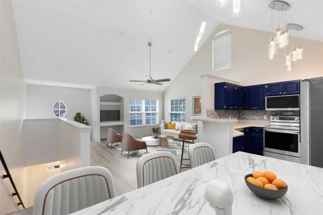 One or more photo(s) has been virtually staged. Major price reduction for a limited time! SELLER FINANCING options available! Welcome to this beautifully renovated 3 bedroom condo nestled within the sought-after Hamptons community. This second-floor walkup offers a private and serene living experience with elegant vaulted ceilings and no upstairs neighbors. The condo features all-new luxury vinyl plank and tile flooring and elegantly tall baseboards, creating a seamless blend of modern style and durability throughout the space. The kitchen boasts sleek quartz countertops, stainless steel LG appliances, cabinetry with a bold contemporary look, and a breakfast bar that opens to the spacious living area, perfect for both entertaining and casual dining. Natural light floods the condo through large, elevated windows, enhancing the bright and inviting atmosphere. Both bathrooms shine with their updated tile flooring, vanities, fixtures, hardware, and LED smart mirrors. A ring doorbell is included for added peace of mind. Freshly painted throughout. Residents of the Hamptons community enjoy a wealth of amenities, including a 24-hour guard, two swimming pools, a fitness center with a basketball court, scenic walking trails around the lake, several gazebos, and a pier. Centrally located, this condo is close to Universal Studios and the Mall at Millenia, providing easy access to premier entertainment, shopping, and dining options. This beautifully modernized condo invites you to experience the luxurious Hamptons lifestyle. Don't miss the opportunity to make this exceptional condominium home yours!
