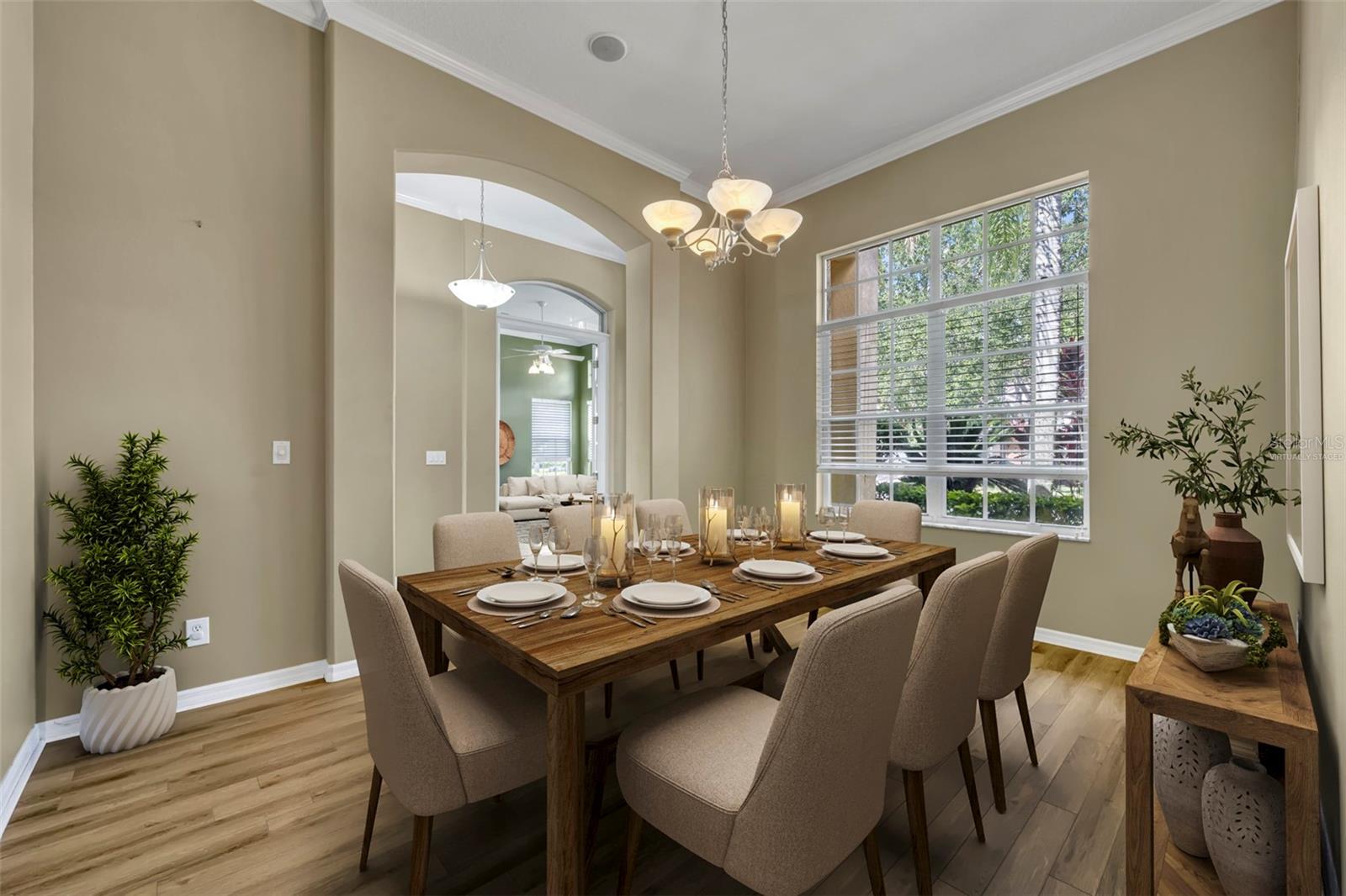 Crown Molding, Eat-in Kitchen, Kitchen/Family Room Combo, Primary Bedroom Main Floor, Solid Surface Counters, Tray Ceiling(s), Walk-In Closet(s), Window Treatments