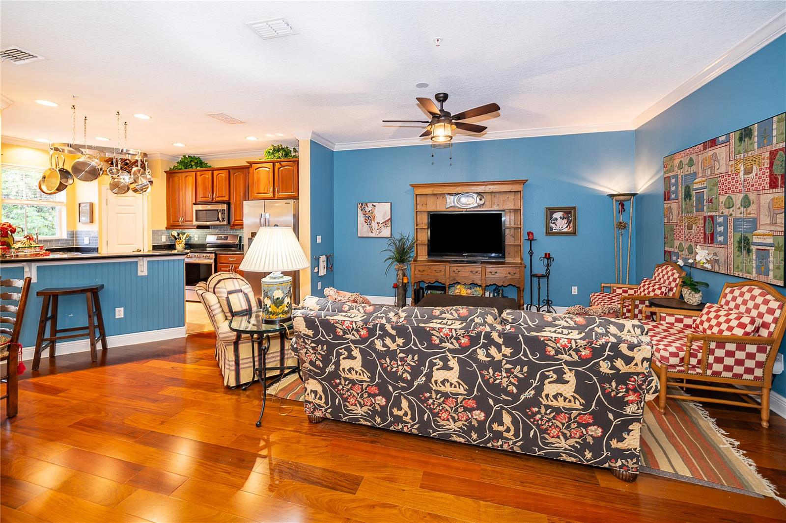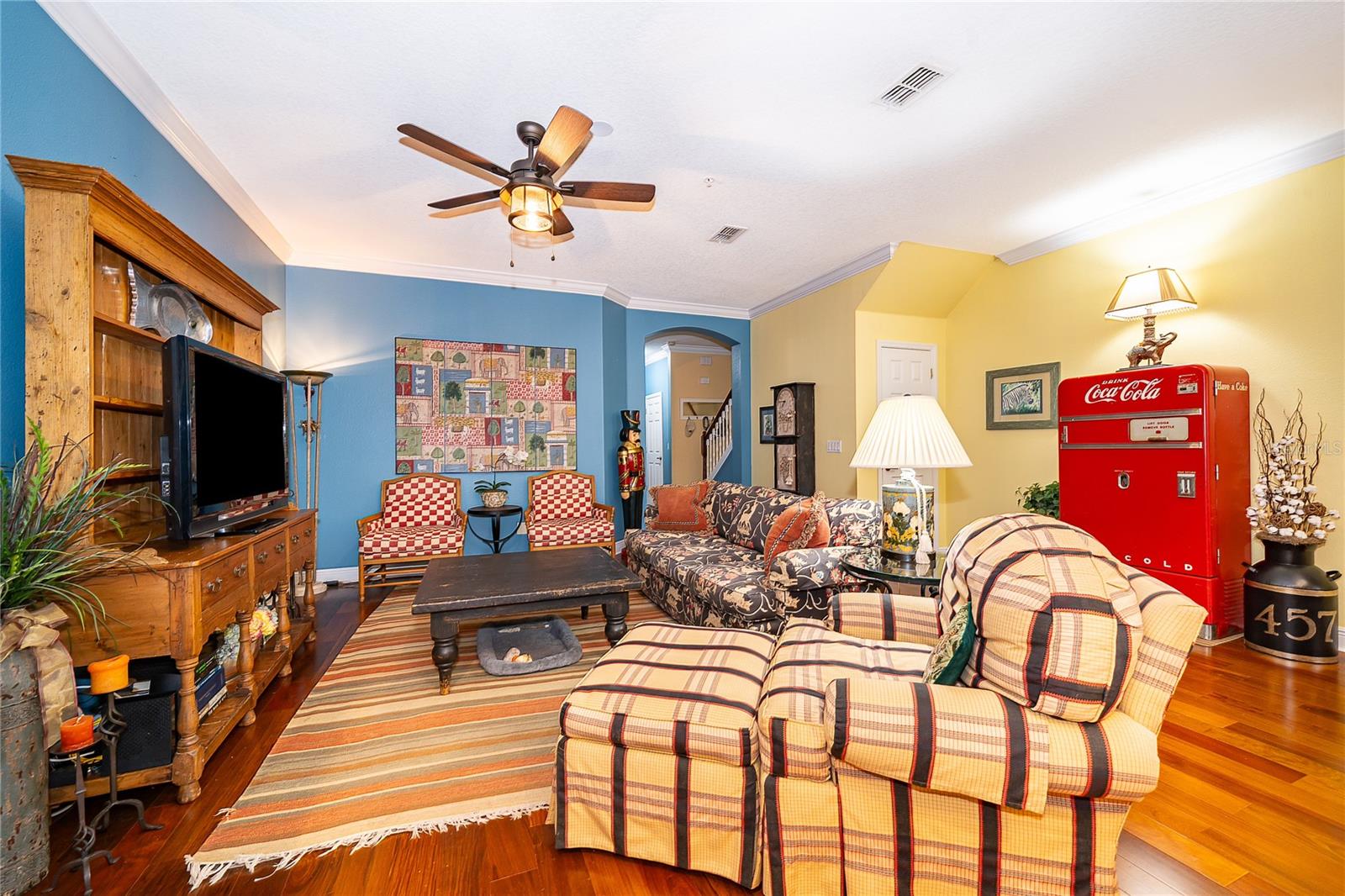 Ceiling Fans(s), High Ceilings, Kitchen/Family Room Combo, Open Floorplan, PrimaryBedroom Upstairs, Solid Surface Counters, Split Bedroom, Stone Counters, Thermostat, Walk-In Closet(s), Window Treatments
