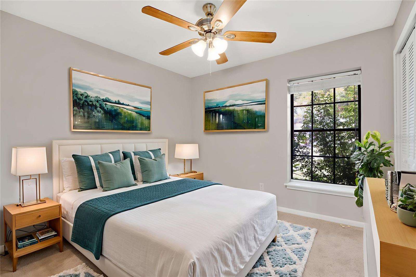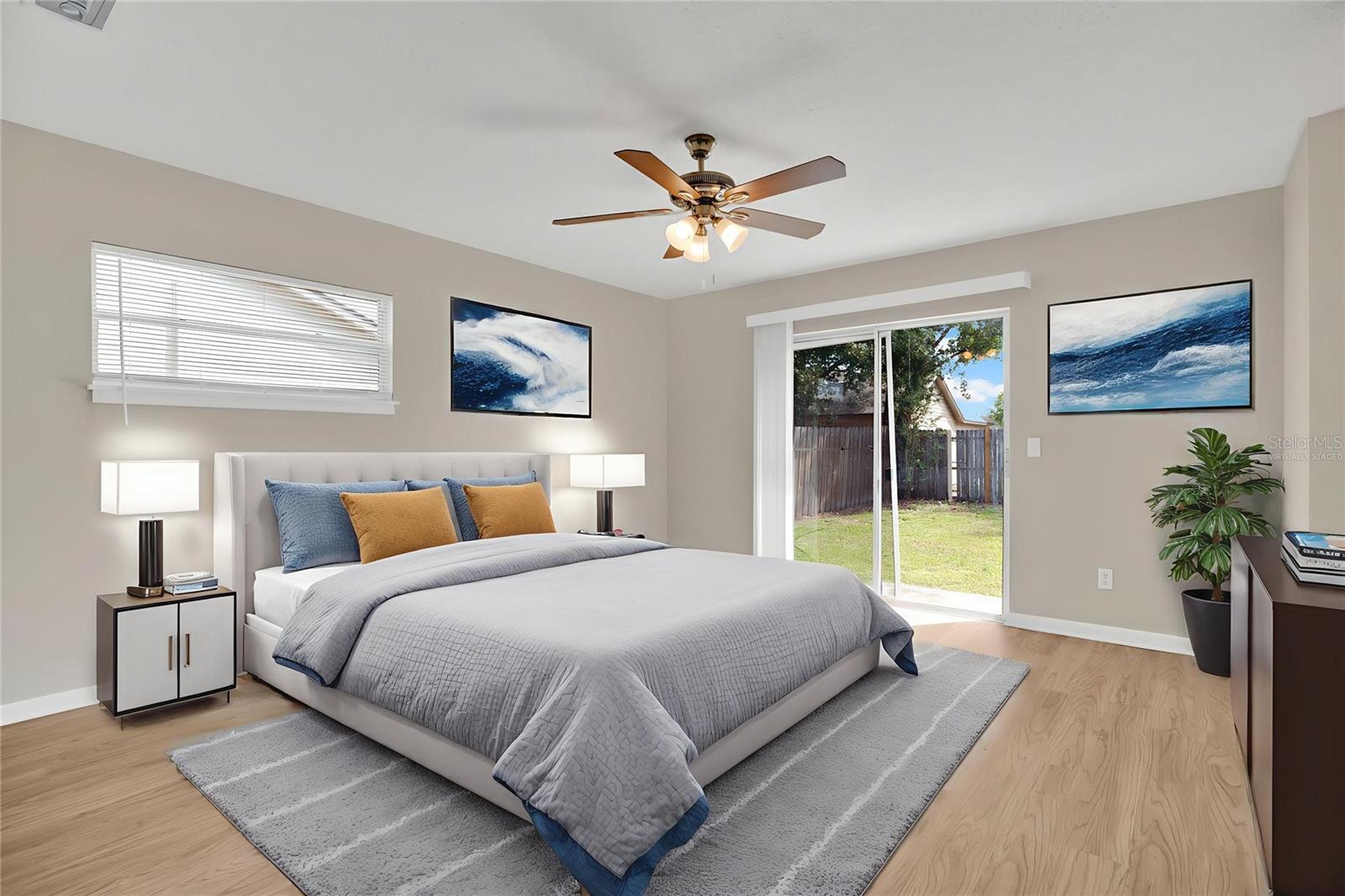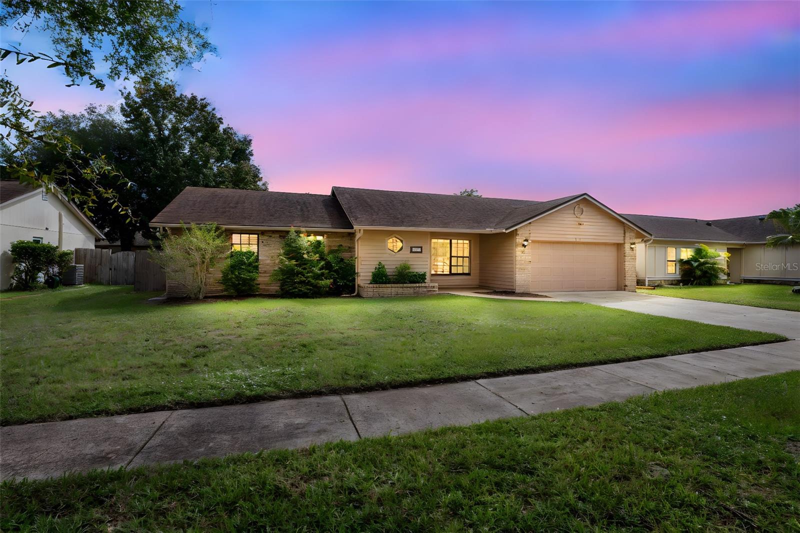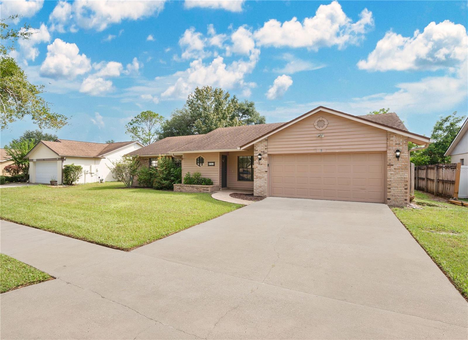 One or more photo(s) has been virtually staged. Tucked away on a quiet cul-de-sac in the sought-after Hunter’s Trace community, this move-in ready ranch-style home blends comfort, convenience, and charm. With sidewalk-lined streets, a spacious double-wide driveway, and a low yearly HOA, it’s the kind of neighborhood you’ll love coming home to. Step inside through the foyer and you’re immediately welcomed by an open floor plan. The living room flows seamlessly into the dining area, where French doors open to a patio area—perfect for indoor-outdoor living. The kitchen offers stainless steel appliances, a tiled backsplash, ample cabinetry, and a breakfast bar that overlooks the family/bonus room. Whether you’re entertaining or enjoying a quiet night in, the layout keeps everything connected. The primary suite is thoughtfully designed with dual closets and a private ensuite featuring two separate vanity areas, divided by a pocket door for added privacy. A sliding glass door leads directly to a personal patio retreat, extending the space outdoors. Two additional bedrooms share a full bath with a tiled shower/tub combo—ideal for guests or family. At the back of the home, the large family/bonus room opens through sliding glass doors to another patio overlooking the fenced-in backyard. With plenty of room for gatherings, grilling, or simply relaxing under the Florida sun, it’s a space ready for summer BBQs and weekend fun. Located just minutes from UCF, Research Park, shopping, dining, and major highways, this home offers both peace and accessibility.