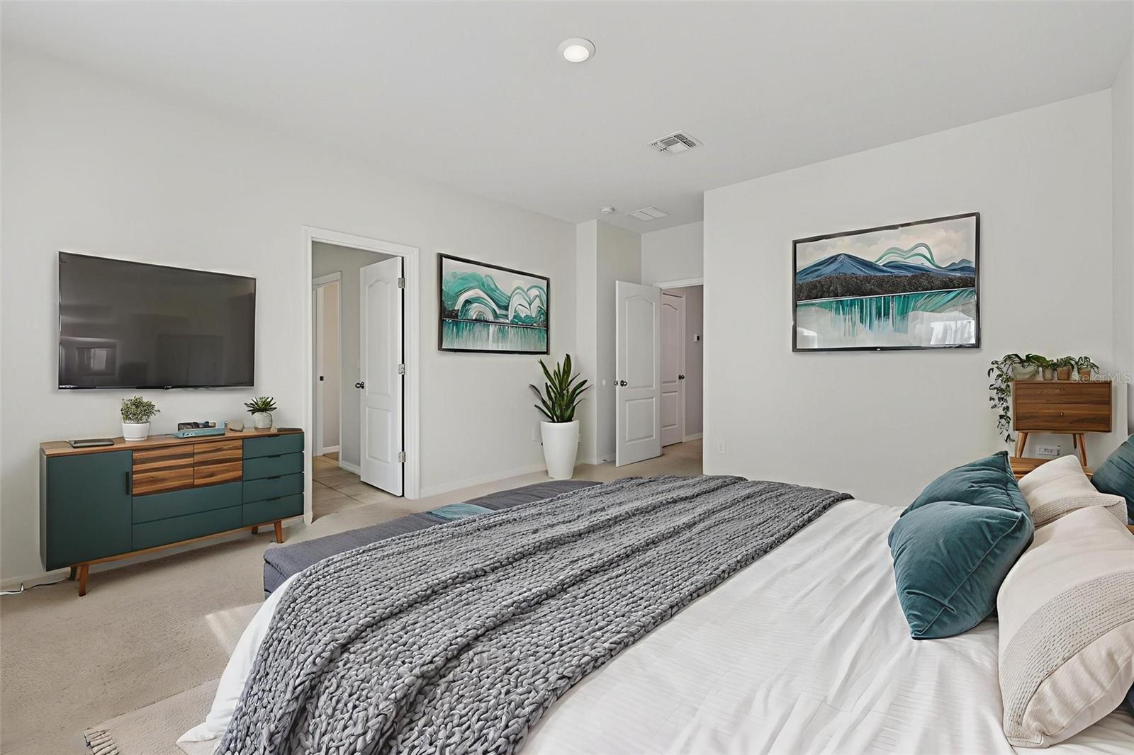 Ceiling Fans(s), Crown Molding, Kitchen/Family Room Combo, PrimaryBedroom Upstairs, Solid Surface Counters, Solid Wood Cabinets, Thermostat, Tray Ceiling(s), Walk-In Closet(s)
