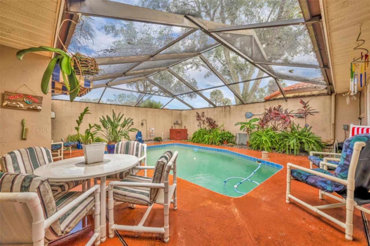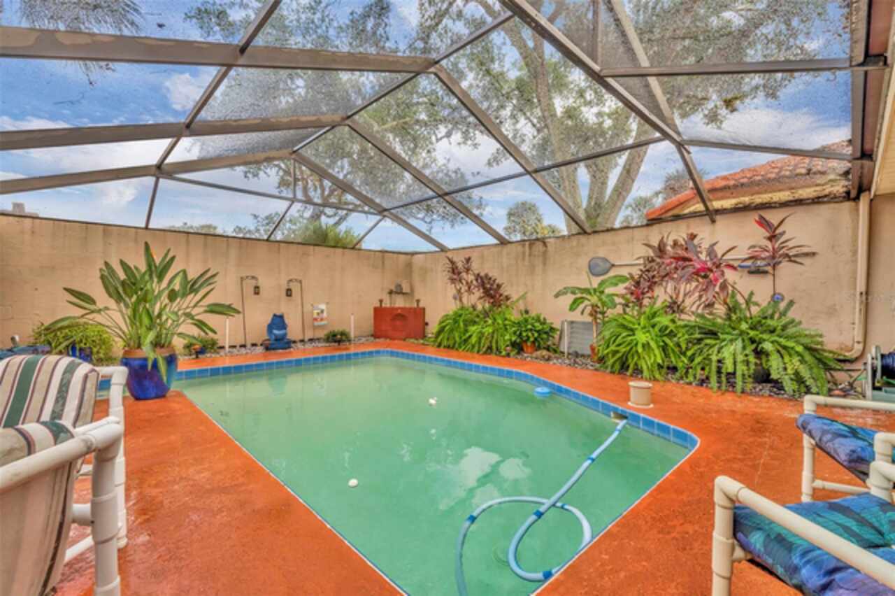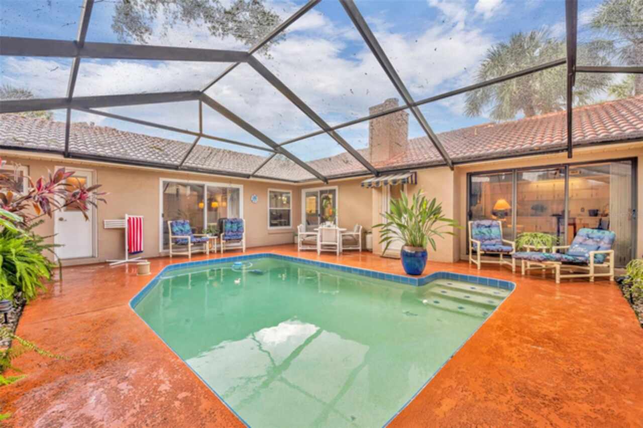 Welcome to this charming and well maintained 3-bedroom, 2-bath home in the quiet, gated community of Island Club at Rosemont. Featuring a spacious floor plan with a cozy gas fireplace (connected to an owned propane tank), this home is perfect for relaxing or entertaining. Enjoy the flexibility of a 3rd bedroom that has been converted to more of a family room with a built-in wet bar, which is ideal for a home office or entertainment space. The kitchen is equipped with a functional trash compactor, ample cabinetry, and a unique atrium which allows for ample natural light. Step outside to your private pool oasis, accessible from the majority of rooms in the home. Whether you're hosting guests or enjoying a quiet evening, the seamless indoor-outdoor flow adds to the charm of this property. Additional features include 2-car garage with washer and dryer. As well as double paned windows throughout. Dont miss this opportunity to own a unique pool home.
