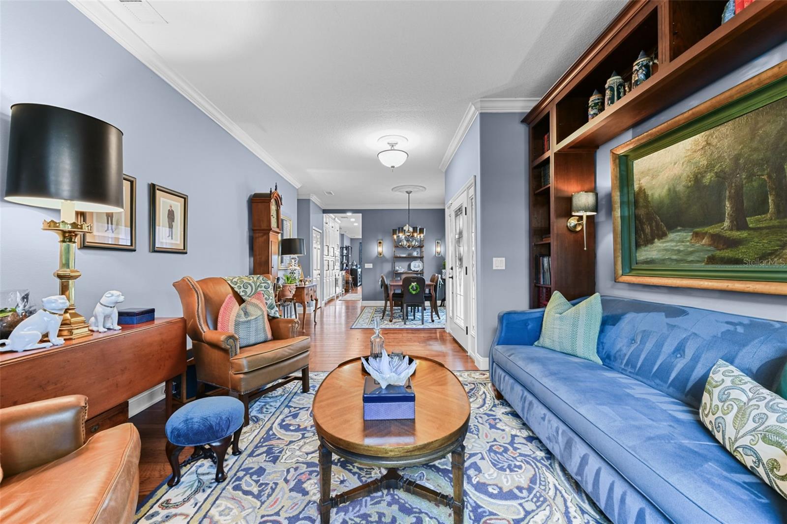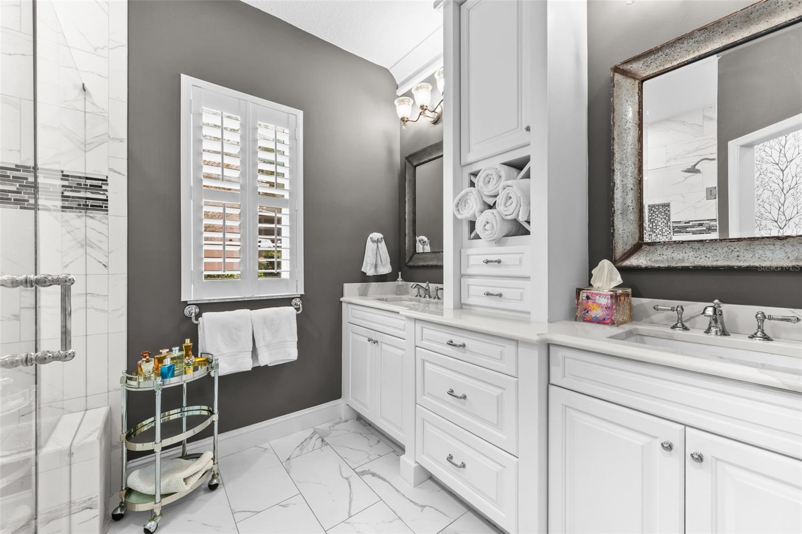 Built-in Features, Crown Molding, Eat-in Kitchen, High Ceilings, Open Floorplan, Primary Bedroom Main Floor, Split Bedroom, Stone Counters, Thermostat, Walk-In Closet(s), Window Treatments