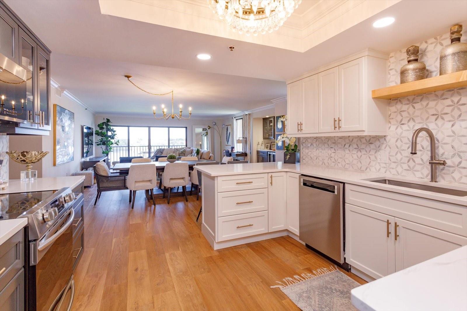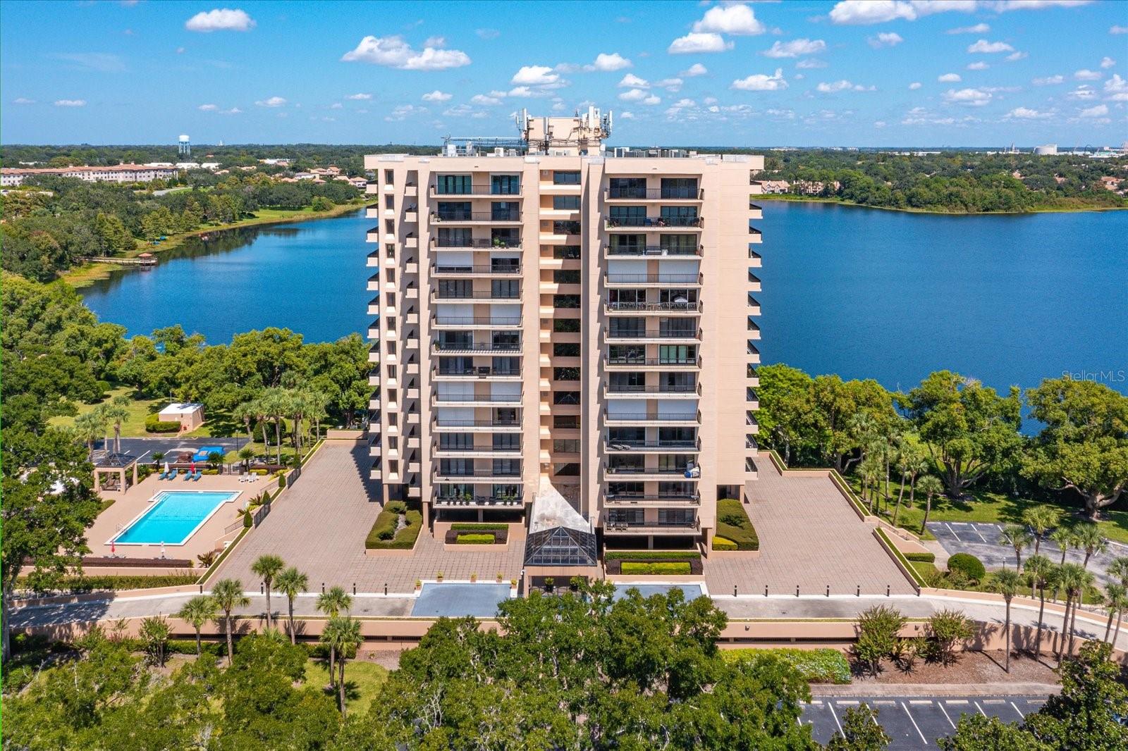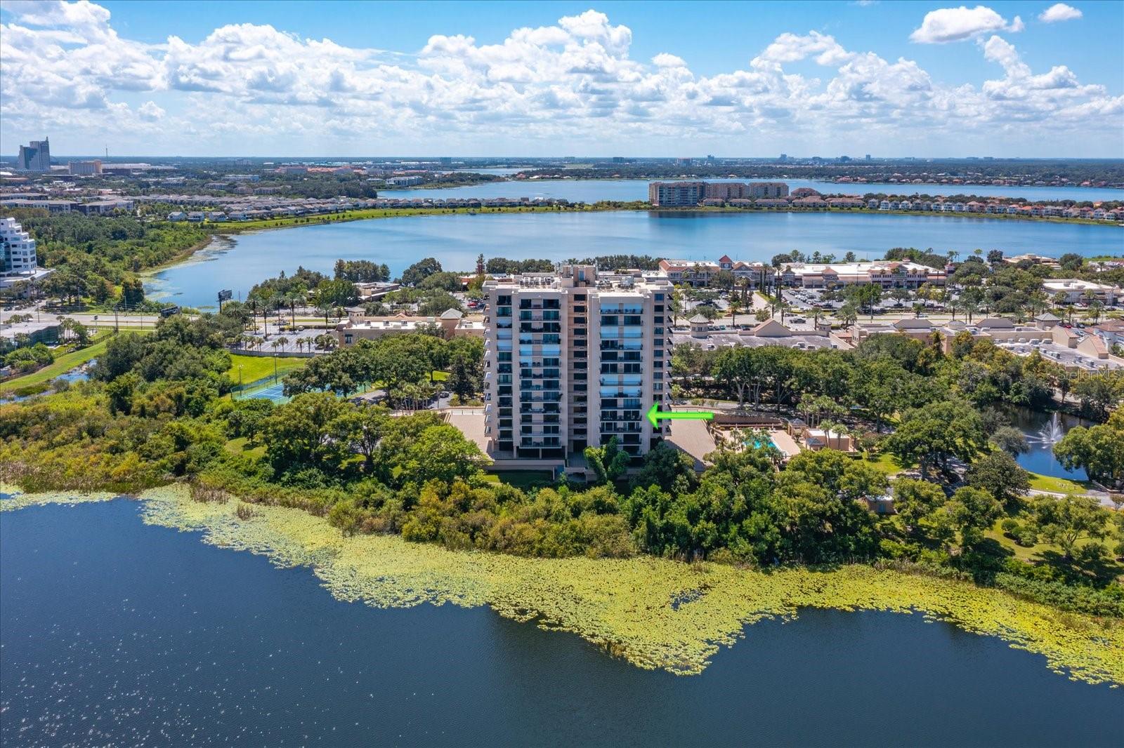 Private and Pristine! This custom remodeled luxury condo home sits on Spring Lake within the privately gated and manned building entrance to Bayview Reserve in the highly desirable Dr. Phillips area. In 2020, new features include new A/C (inside and out), tankless hot water heater (water included in HOA), new windows. The chef's dream kitchen offers all new Gallery Frigidaire appliances, custom cabinetry design open to entertaining areas and views overlooking the lake. Open concept living room with lake views offering a serving and entertaining bar with custom cabinetry designs as well, along with stunning solid wood floors throughout. Primary bedroom and en suite incorporates same luxury and fine living with lake views and balcony. Secondary bedroom fit for guests of highest scrutiny includes office area and en suite. No stone left unturned in this remodel. Laundry features new front load washer, dryer, additional storage, pantry. Enjoy stunning sunset views and relaxation from the balcony that runs the entire width of the unit. Residence comes with assigned parking in parking garage which space includes Tesla charging station and climate controlled 4x8 storage. Bayview Reserve amenities include sauna rooms for both men and women, fitness gym, entertainment room with full kitchen and bar, tennis, pickleball, newly resurfaced pool, and brand new roof for the complex. Bayview is walking distance to restaurant row for high end and fine dining. Shopping, major thoroughfares, theme parks and international airport all within close proximity. Walk to Chabad about 1 mile.