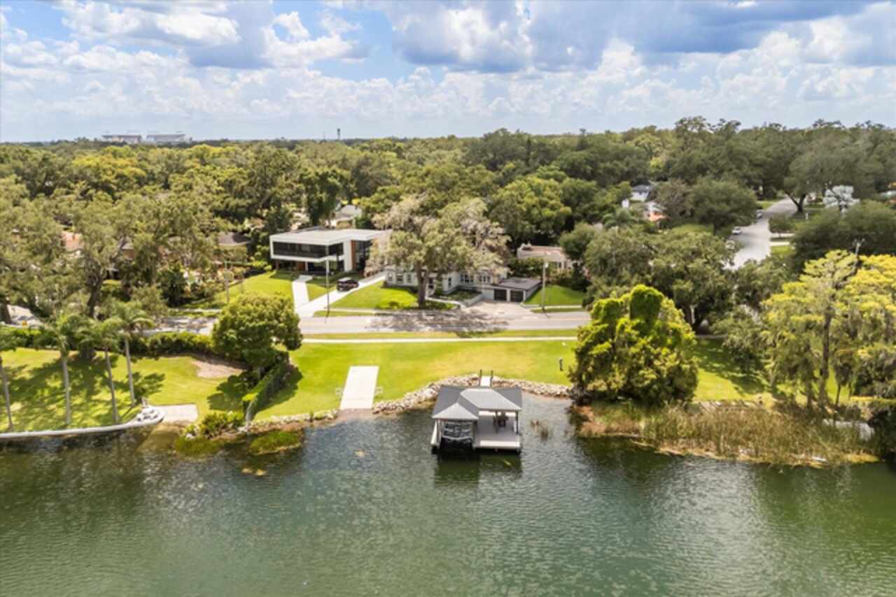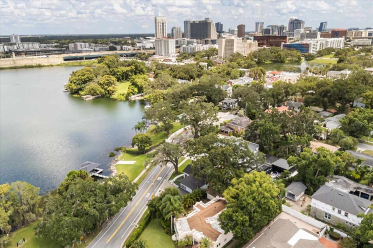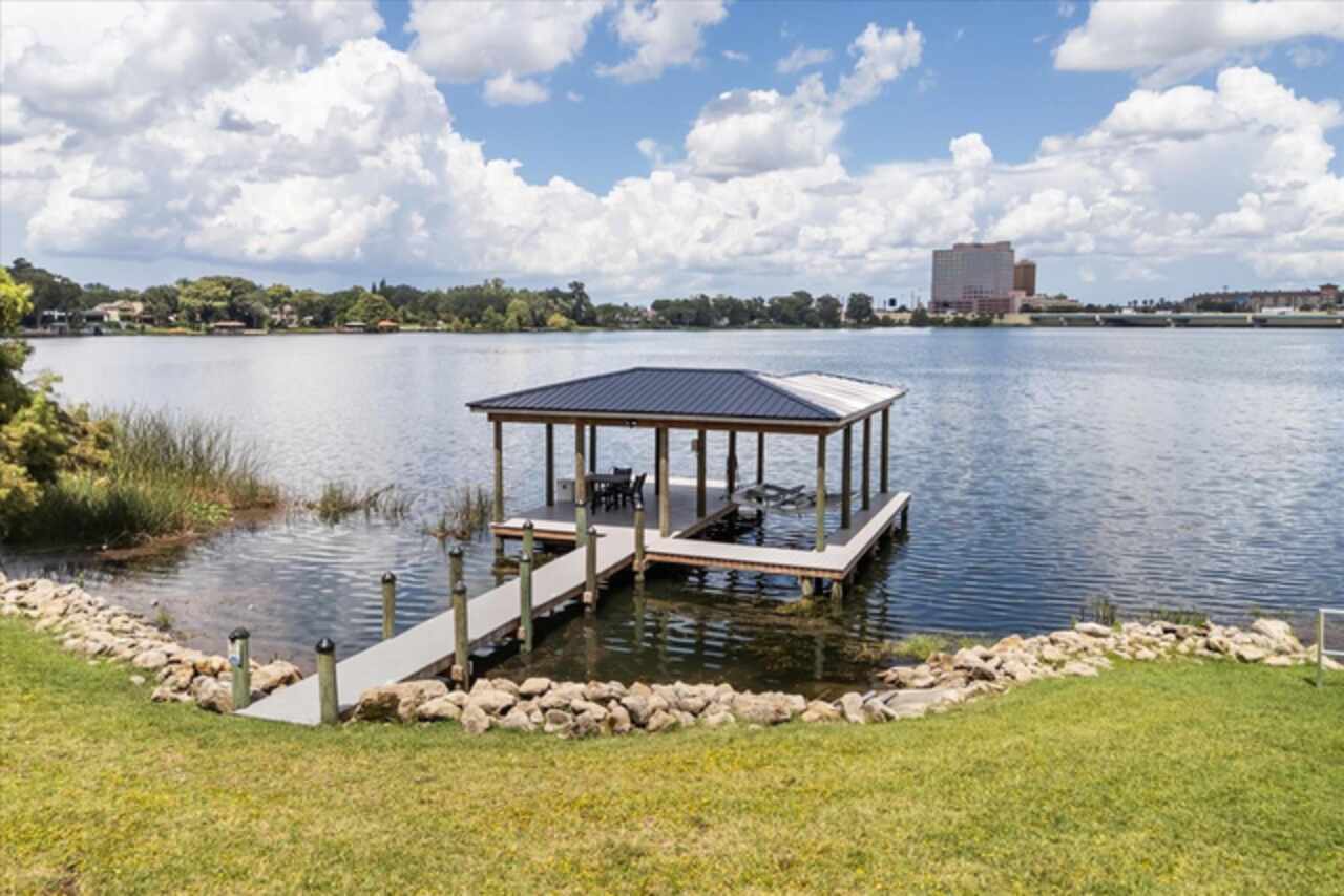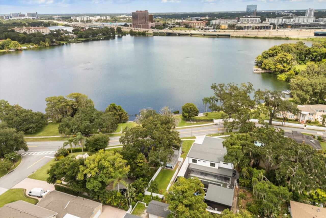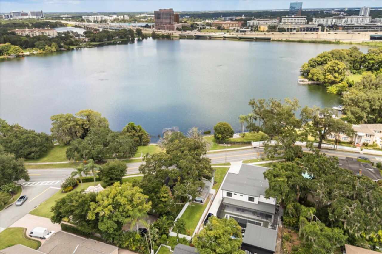 This fully renovated 3-bed, 3.5-bath home offers rare lakefront living with 152 feet of private frontage on Lake Concord—including the only private boat ramp on the lake. Bold modern design meets effortless functionality in a light-filled, open-concept layout with panoramic water views throughout. Dual primary suites feature spa-like baths and custom closets. The designer kitchen impresses with high-gloss cabinetry, quartz counters, glass tile backsplash, and premium KitchenAid appliances. Entertain seamlessly in the lake-facing great room, open dining area, or corner office with sunrise views. Every major system is updated: 2023 roof, new electrical (200A underground service with generator-ready transfer switch), new water heater, and all-new finishes inside and out—including modern stucco, garage doors, and trim. Enjoy a rare Central Florida basement with a half bath and storage/flex space, plus a fully fenced backyard with a hot tub and pergola-covered deck. Across the street, your private lakefront parcel includes a covered dock with power, water, LED lighting, and a boat lift—offering downtown Orlando skyline views and glowing evening ambiance. Located minutes from Downtown Orlando, Ivanhoe Village, and major roadways—this is high-style, turn-key lakefront living in the heart of College Park
