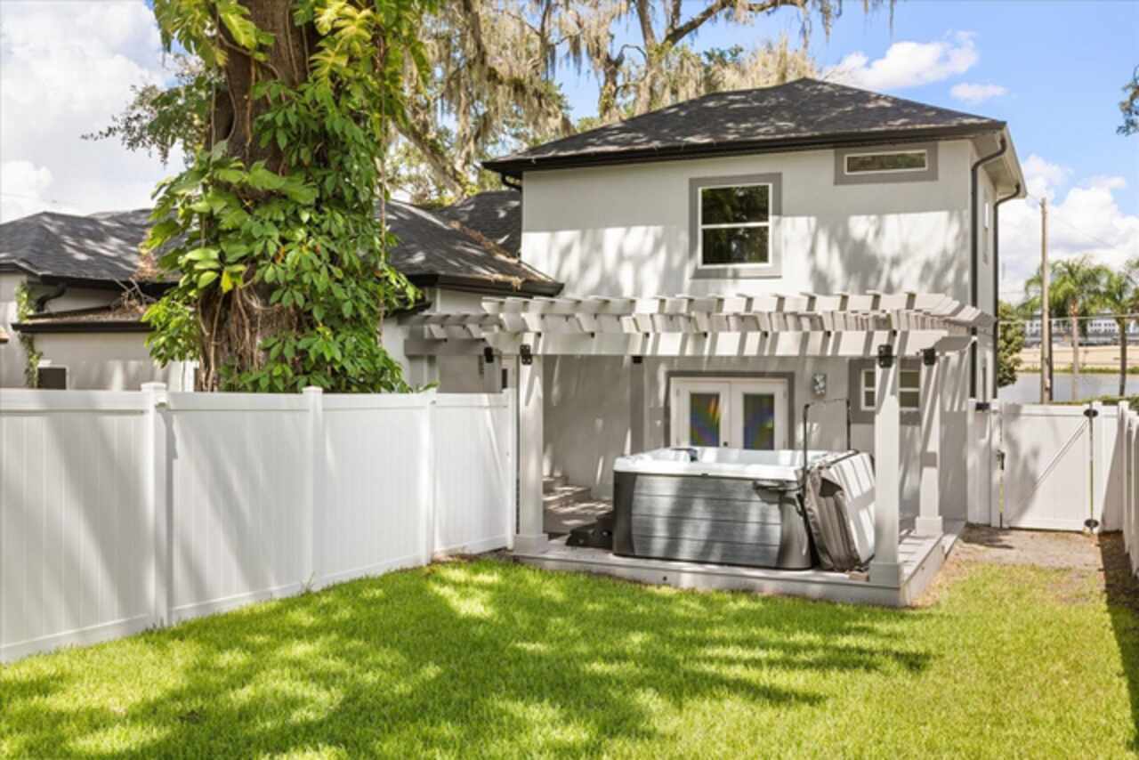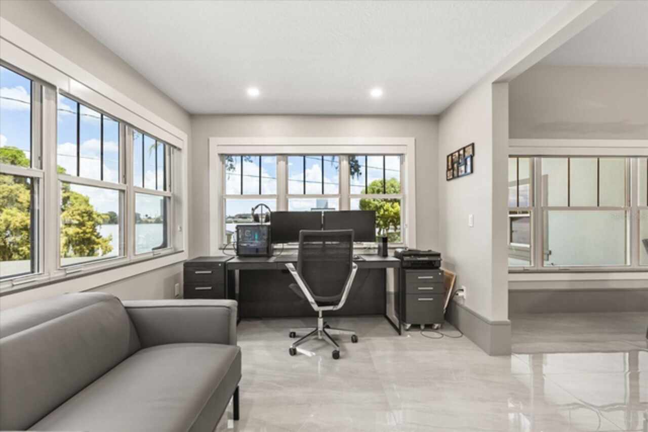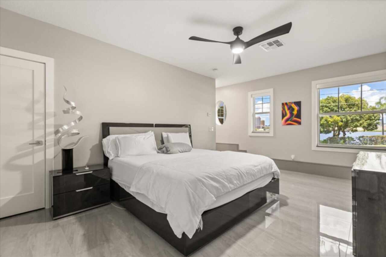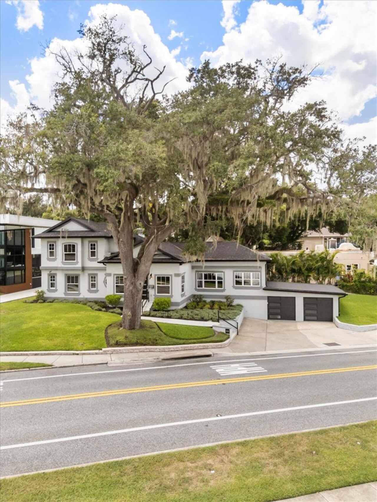 This fully renovated 3-bed, 3.5-bath home offers rare lakefront living with 152 feet of private frontage on Lake Concord—including the only private boat ramp on the lake. Bold modern design meets effortless functionality in a light-filled, open-concept layout with panoramic water views throughout. Dual primary suites feature spa-like baths and custom closets. The designer kitchen impresses with high-gloss cabinetry, quartz counters, glass tile backsplash, and premium KitchenAid appliances. Entertain seamlessly in the lake-facing great room, open dining area, or corner office with sunrise views. Every major system is updated: 2023 roof, new electrical (200A underground service with generator-ready transfer switch), new water heater, and all-new finishes inside and out—including modern stucco, garage doors, and trim. Enjoy a rare Central Florida basement with a half bath and storage/flex space, plus a fully fenced backyard with a hot tub and pergola-covered deck. Across the street, your private lakefront parcel includes a covered dock with power, water, LED lighting, and a boat lift—offering downtown Orlando skyline views and glowing evening ambiance. Located minutes from Downtown Orlando, Ivanhoe Village, and major roadways—this is high-style, turn-key lakefront living in the heart of College Park