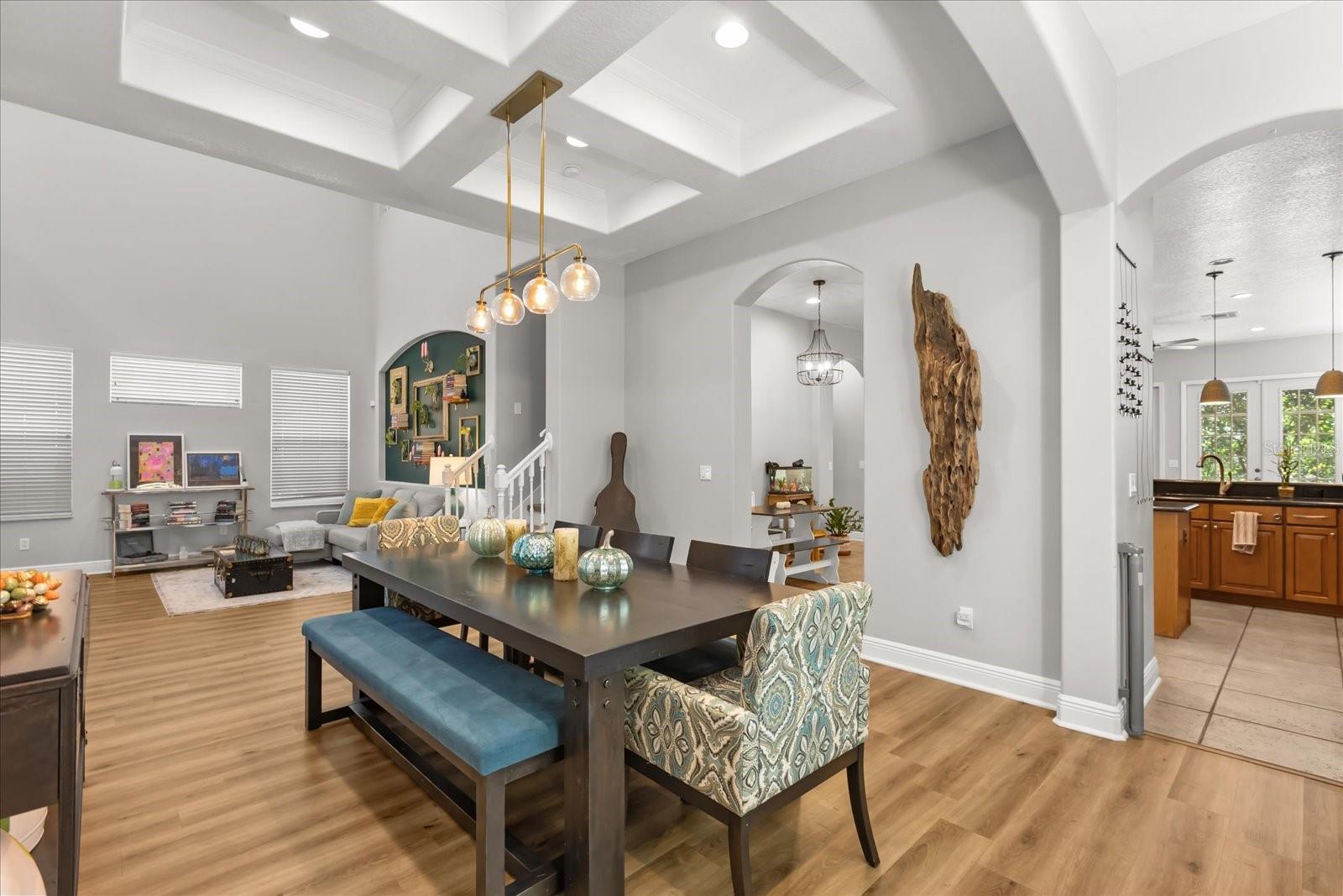 Built-in Features, Cathedral Ceiling(s), Ceiling Fans(s), Coffered Ceiling(s), Crown Molding, Eat-in Kitchen, High Ceilings, Kitchen/Family Room Combo, Open Floorplan, Primary Bedroom Main Floor, Solid Wood Cabinets, Stone Counters, Thermostat, Tray Ceiling(s), Walk-In Closet(s)