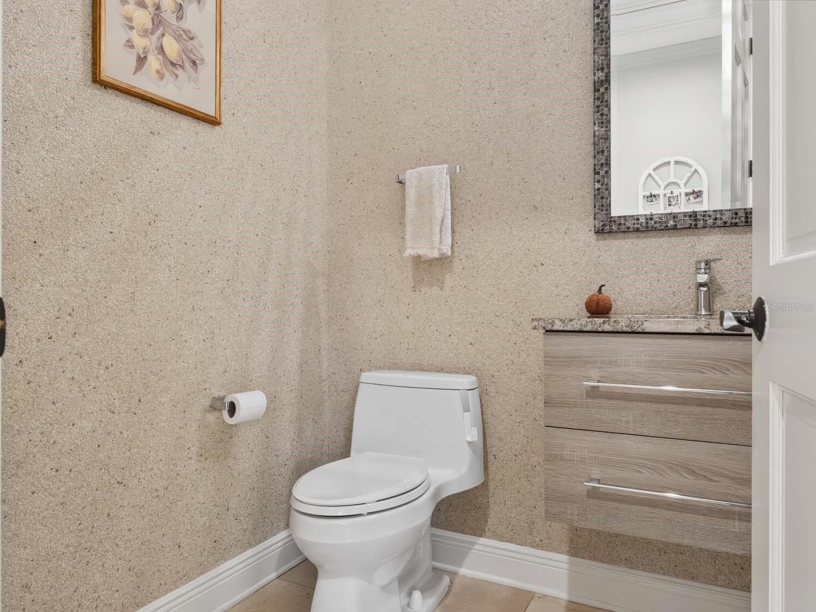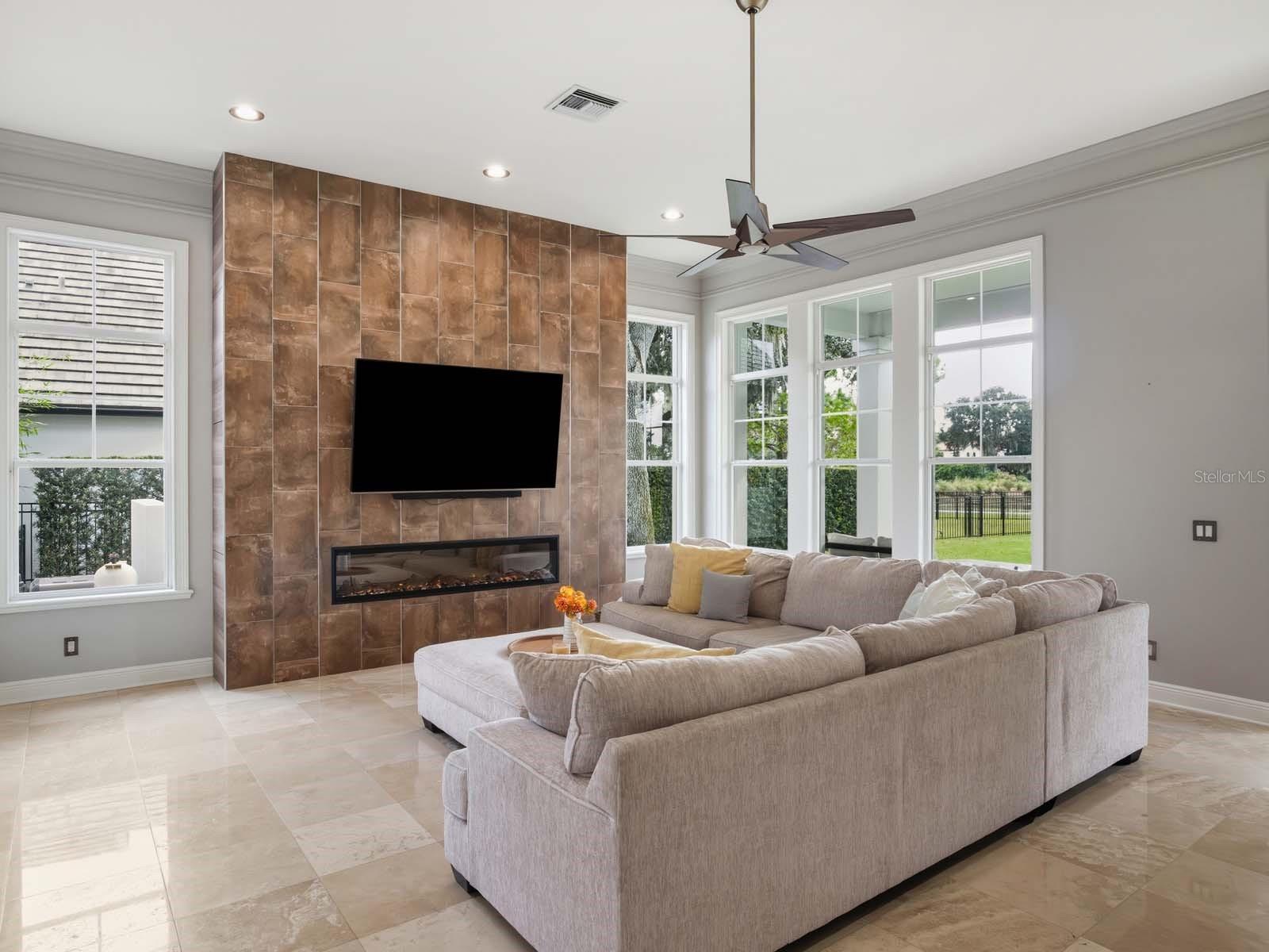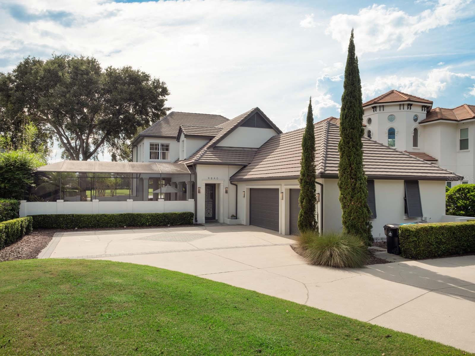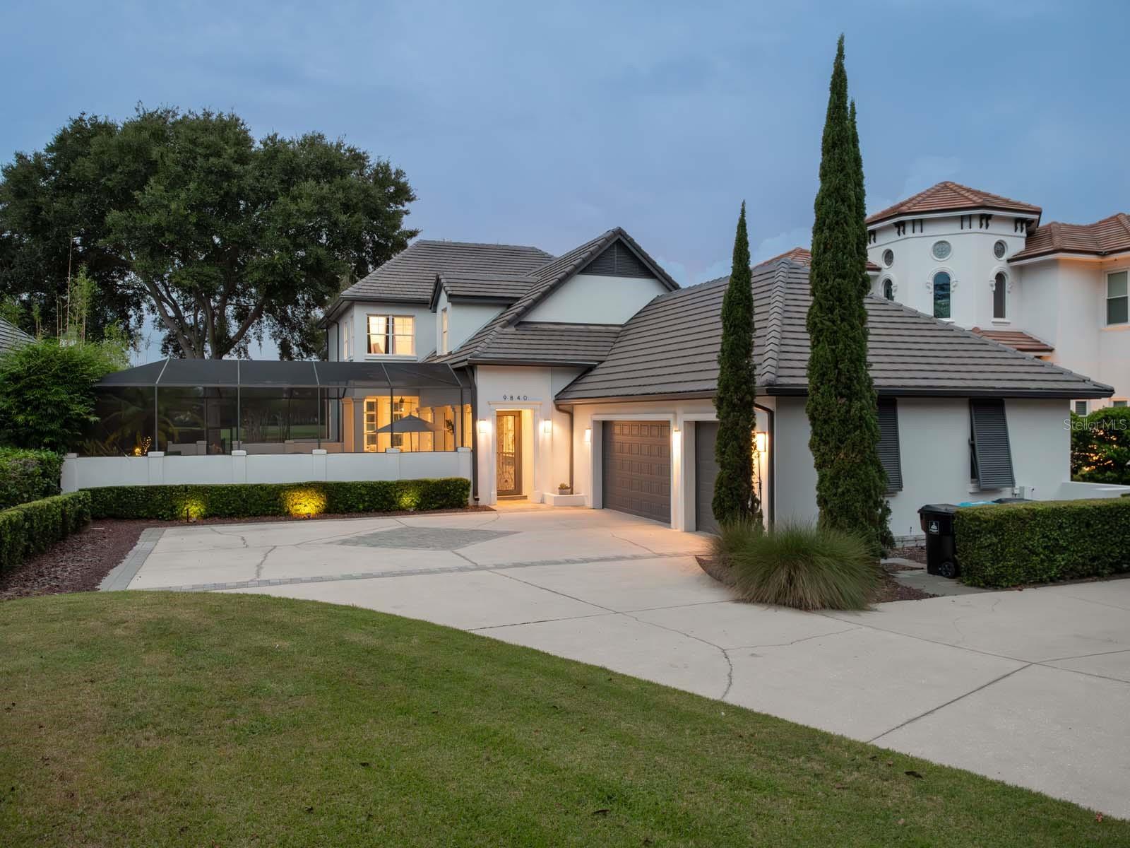 This private, tucked-away residence is perfectly located on the front nine of Lake Nona Golf & Country Club’s championship golf course. Thoughtful upgrades, an abundance of light-filled spaces and sensational sunset views distinguish this beautiful courtyard home. An expansive front yard, with mature landscaping and winding driveway, welcomes you into the screen-enclosed courtyard with a serene salt water, heated pool and spa. Elevated and updated finishes throughout the interior, including polished Italian travertine flooring, sleek light fixtures and custom tile selections, create a seamless integration of modern comfort and traditional beauty. The kitchen, sharing its space with an open dining area, features an oversized island with ample storage, elegant custom cabinetry and appliances by Wolf, SubZero and Bosch. A butler’s pantry with a wine fridge and storage is perfect for relaxing and entertaining alike. The first floor also includes a spacious owner’s suite with a spa-like bathroom retreat offering a freestanding tub, walk-in glass enclosed shower, with multiple spray options, and a large closet with ample shoe storage. The adjacent family room is anchored by a stunning entertainment wall, with fire place, and features French-door access to the covered lanai. A contemporary glass railed, lit staircase ascends to the second floor, which provides three bedrooms, including an additional owner’s suite. Accentuated by a convenient wet bar, the entertainment loft is flooded with natural light, and is in a prime location within the home. Opening to a rebuilt balcony, this room captures panoramic views of Holes #3, #4 and #5. Additional features include an outdoor grilling station, first floor laundry room and a three-car garage.